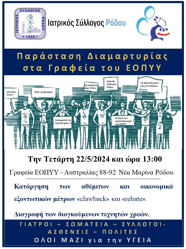 - Ο Ιατρικός Σύλλογος Ρόδου θα πραγματοποιήσει συμπαράσταση διαμαρτυρίας την Τετάρτη 22/5/2024 και ώρα 13:00 στα γραφεία του ΕΟΠΥΥ στη Νέα Μαρίνα Ρόδου, για τα δυσβάσταχτα μέτρα που πλήττουν την βιωσιμότητα των Διαγνωστικών Εργαστηρίων των ιατρών μελών του Ι.Σ.Ρ.