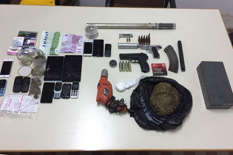 Κατασχέθηκαν πιστόλι με σιγαστήρα, -504- γρ. κάνναβης, -47,5- κοκαΐνης, ηλεκτρικό τρυπάνι, γεμιστήρα πολεμικού όπλου, -21- γεμιστήρα πολεμικού όπλου, φυσίγγια κ.α.
