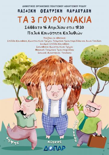Ο Δημοτικός Οργανισμός Πολιτισμού Αθλητισμού Ρόδου συνεχίζει την σειρά παιδικών παραστάσεων με τίτλο «Τα 3 γουρουνάκια» που θα πραγματοποιηθεί σε Δημοτικές Ενότητες του νησιού μας. Ο δεύτερος σταθμός της περιοδείας θα λάβει χώρα στην Παλιά Κοινότητα Καλυθιών.