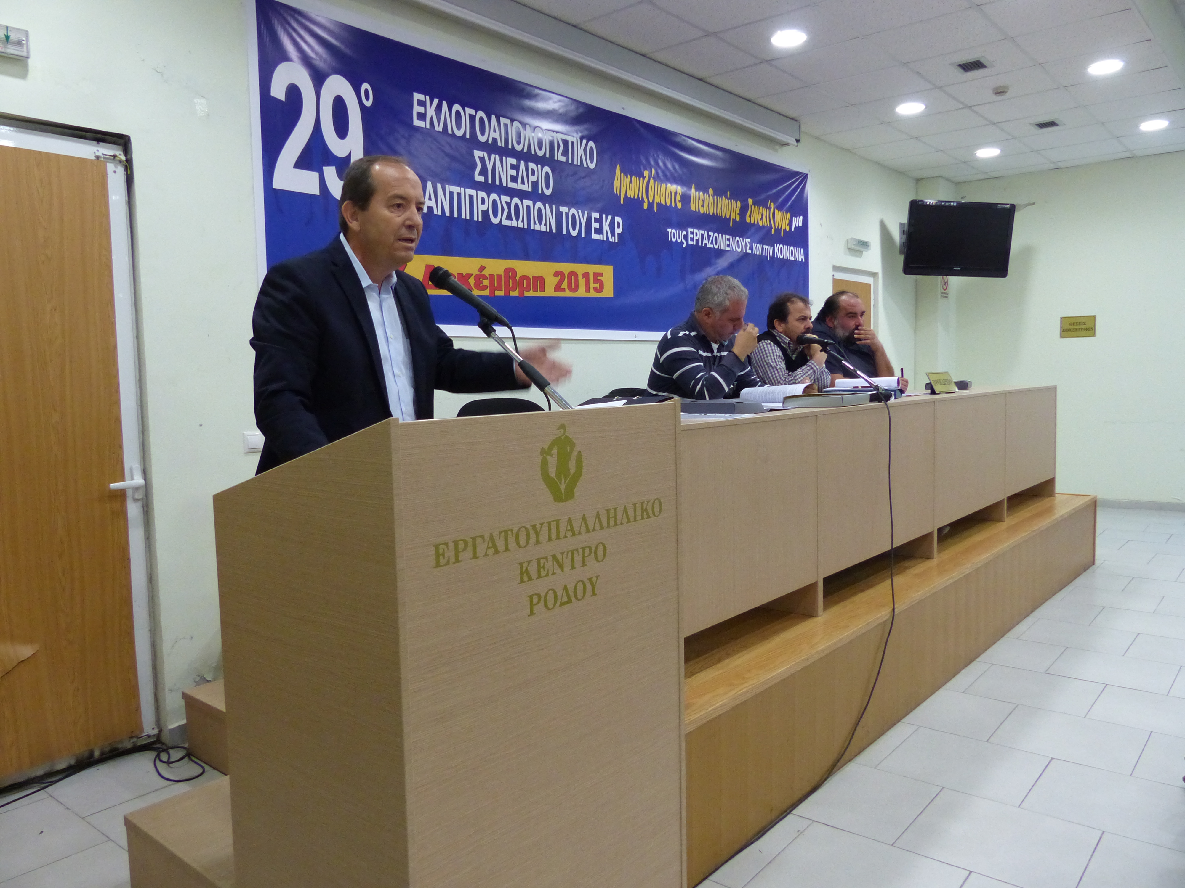 Συναδέλφισσες, Συνάδελφοι, Με χαρά σας καλωσορίζω στο 29ο Εκλογοαπολογιστικό Συνέδριο της κορυφαίας συνδικαλιστικής οργάνωσης της περιοχής μας. Από αυτό το συνέδριο στέλνουμε μήνυμα ενότητας και αγωνιστικής συνέχειας που οι καιροί επιβάλλουν. Περάσανε τρία χρόνια έντονης συνδικαλιστικής δράσης και αγώνων. Τρία χρόνια αγώνων στους δρόμους και τις πλατείες φωνάζοντας δυνατά "ΦΤΑΝΕΙ ΠΙΑ! ΔΕΝ ΑΝΤΕΧΟΥΜΕ"! Δεν αντέχουμε άλλη ύφεση, άλλες απολύσεις, άλλα λουκέτα, μεγαλύτερη καταστρατήγηση των εργασιακών μας δικαιωμάτων, μισθούς πείνας και συντάξεις που είναι επιδόματα φτώχειας! Τα τρία τελευταία χρόνια μετρήσαμε επιπλέον χιλιάδες εργαζόμενους να προστίθενται στις λίστες ανέργων, είδαμε πολλούς φίλους μας να χάνουν τη δουλειά τους, αποχαιρετήσαμε αγαπημένα μας πρόσωπα, που εγκατέλειψαν τη χώρα για μια καλύτερη τύχη και είδαμε τα φρέσκα μυαλά αυτού του τόπου, το μέλλον της χώρας να διαπρέπουν στο εξωτερικό αφού η Πολιτεία δεν μπόρεσε να κάνει κάτι για να τα κρατήσει εδώ. Αυτή, συναδέλφισσες και συνάδελφοι είναι η ζοφερή πραγματικότητα! Η Ευρώπη των λαών και της Αλληλεγγύης έχει μετατραπεί σε μια Ευρώπη δυο ταχυτήτων. Οι μεγάλοι και οι ισχυροί συνθλίβουν καθημερινά τους μικρότερους. Τους γυρνούν την πλάτη και με εκδικητικό τρόπο τους αναγκάζουν να ζουν στη φτώχεια, τη λιτότητα, την ανέχεια και την ύφεση. Τα πακέτα στήριξης της ΕΕ και του ΔΝΤ μπορεί να προσφέρουν μικρές ανάσες στη ρημαγμένη ελληνική οικονομία, έχουν ως αποτέλεσμα όμως τη συνεχή εξάρτηση από τα μνημόνια, την τρόικα και το κουαρτέτο των δανειστών. Παράλληλα με την οικονομική κρίση η Ευρώπη βιώνει μια βαθιά κρίση ταυτότητας και αυτό γίνεται κατανοητό και αντιληπτό, αν χρησιμοποιήσουμε ένα πρόσφατο παράδειγμα. Την προσφυγική κρίση. Εκατοντάδες χιλιάδες άνθρωποι με κίνδυνο της ζωής τους εγκαταλείπουν τις χώρες τους σε μια προσπάθεια να βρουν ένα καλύτερο αύριο από το εμπόλεμο παρόν γι' αυτούς και τα παιδιά τους. Και η Ευρώπη και οι συντηρητικοί κύκλοι της τι κάνουν; Αντί να τους επιτρέψουν να πάνε απευθείας στη χώρα επιλογής τους, προτιμούν τις εικόνες των νεκρών σωμάτων στα παγωμένα νερά του Αιγαίου! Στην Ελλάδα έντονα πολιτικά γεγονότα, πρωτοφανείς κοινωνικές καταστάσεις, δραματικές αλλαγές του εργασιακού πλαισίου, αύξηση της ανεργίας και πολλά άλλα έδωσαν τη χαριστική βολή στην κοινωνία και την οικονομία της χώρας. Η φτώχεια, η εξαθλίωση, η ανεργία, η λιτότητα, οι απολύσεις και οι φοροεπιδρομές κυριαρχούν στη ζωή μας και τη μεταλλάσσουν. Οι απλήρωτοι εργαζόμενοι δημιουργούν μια άτυπη μορφή εργαζόμενων με την ανοχή του κράτους, αφού στην πραγματικότητα δεν υπάρχουν ελεγκτικοί μηχανισμοί, ενώ οι εργοδότες συνεχίζουν τις αντεργατικές τακτικές τους, την ώρα που ο ιδιωτικός τομέας συνεχίζει να δέχεται ανελέητα χτυπήματα, και ο δημόσιος τομέας μπαίνει στο στόχαστρο με διαθεσιμότητες εργαζομένων. Ας δούμε όμως συνοπτικά τι συντελέστηκε τα τρία προηγούμενα χρόνια. Ποια είναι τα σημαντικότερα πολιτικά και κοινωνικά γεγονότα από το 2012 μέχρι σήμερα και στα ο οποία το Ε.Κ.Ρ διαδραμάτισε σημαντικό ρόλο. Μέσα σε τρία χρόνια πραγματοποιήθηκαν πέντε εκλογικές διαδικασίες, η μια από αυτές ήταν ένα διχαστικό για το λαό δημοψήφισμα, το ΟΧΙ, το οποίο λίγες ημέρες αργότερα μετατράπηκε σε ένα εκκωφαντικό ΝΑΙ. Έκλεισαν οι τράπεζες, επιβλήθηκαν κεφαλαιακοί έλεγχοι, με αποτέλεσμα σε έ