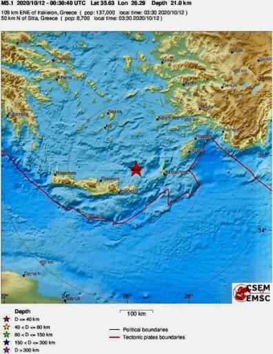Σεισμός 5,1 Ρίχτερ σημειώθηκε στην Κρήτη στις 03:35 τα ξημερώματα, 49 χλμ. βόρεια – ΒΑ της Σητείας. Το εστιακό βάθος εντοπίστηκε στα 21,3 χλμ. Λίγα λεπτά αργότερα, στην ίδια περιοχή σημειώθηκαν τρεις μετασεισμοί, μεγέθους 4,4, 3,2 και 3,1 Ρίχτερ. Μέχρι στιγμής δεν έχουν αναφερθεί ζημιές.