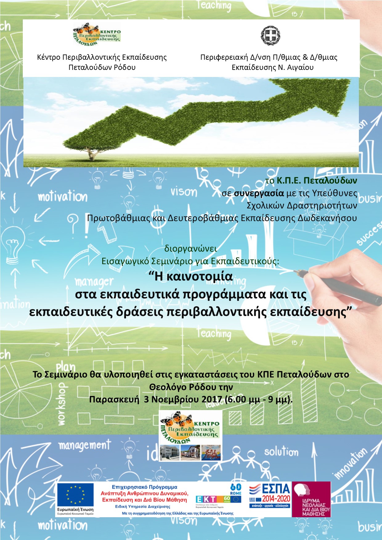 Δελτίο τύπου-«Εισαγωγικό σεμινάριο του Κ.Π.Ε. Πεταλούδων Ρόδου με τίτλο “Η καινοτομία στα εκπαιδευτικά προγράμματα και τις εκπαιδευτικές δράσεις περιβαλλοντικής εκπαίδευσης” -Το Κέντρο Περιβαλλοντικής Εκπαίδευσης (ΚΠΕ) Πεταλούδων Ρόδου, στο πλαίσιο της Πράξης «ΚΕΝΤΡΑ ΠΕΡΙΒΑΛΛΟΝΤΙΚΗΣ ΕΚΠΑΙΔΕΥΣΗΣ (ΚΠΕ)-ΠΕΡΙΒΑΛΛΟΝΤΙΚΗ ΕΚΠΑΙΔΕΥΣΗ» υλοποιείται μέσω του Επιχειρησιακού Προγράμματος «ΑΝΑΠΤΥΞΗ ΑΝΘΡΩΠΙΝΟΥ ΔΥΝΑΜΙΚΟΥ, ΕΚΠΑΙΔΕΥΣΗ ΚΑΙ ΔΙΑ ΒΙΟΥ ΜΑΘΗΣΗ» με τη συγχρηματοδότηση της Ελλάδας και της Ευρωπαϊκής Ένωσης, οργανώνει σε συνεργασία με τις Υπεύθυνες Σχολικών Δραστηριοτήτων Πρωτοβάθμιας και Δευτεροβάθμιας Εκπαίδευσης Δωδεκανήσου, Σεμινάριο Περιβαλλοντικής Εκπαίδευσης, με θέμα: «Η καινοτομία στα εκπαιδευτικά προγράμματα και τις εκπαιδευτικές δράσεις περιβαλλοντικής εκπαίδευσης» Σκοπός του Σεμιναρίου είναι η ενημέρωση και παιδαγωγική στήριξη των εκπαιδευτικών που αναλαμβάνουν Προγράμματα Περιβαλλοντικής Εκπαίδευσης και συμμετέχουν σε εκπαιδευτικές δράσεις περιβαλλοντικής εκπαίδευσης. Στόχος είναι να γνωρίσουν τα προγράμματα του ΚΠΕ, το θεσμικό πλαίσιο υλοποίησης Προγραμμάτων Περιβαλλοντικής Εκπαίδευσης, καθώς και παιδαγωγικές μεθόδους και τεχνικές που μπορούν να αξιοποιήσουν στο σχολείο τους, να τις δοκιμάσουν οι ίδιοι στην πράξη και να “καινοτομήσουν». Έτσι θα εμπλουτίσουν τον τρόπο διδασκαλίας τους, θα μπορούν να έχουν εναλλακτικές προσεγγίσεις που θα βοηθούν τη συμμετοχή και ευαισθητοποίηση των μαθητών που συμμετέχουν στην Περιβαλλοντική Εκπαίδευση. Το Σεμινάριο θα υλοποιηθεί στις εγκαταστάσεις του ΚΠΕ Πεταλούδων στο Θεολόγο Ρόδου την Παρασκευή 3 Νοεμβρίου 2017 (6.00 μμ - 9 μμ).