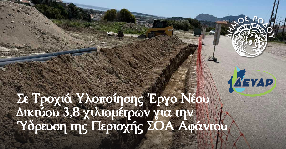 Άλλο ένα κρίσιμο έργο της ΔΕΥΑΡ βρίσκεται σε πλήρη εξέλιξη, με στόχο τη βελτίωση της ποιότητας ζωής των κατοίκων του οικισμού Αφάντου, και ειδικότερα της περιοχής ΣΟΑ. Πρόκειται για την κατασκευή νέου δικτύου ύδρευσης συνολικού μήκους 3,8 χιλιομέτρων, το οποίο σχεδιάστηκε για να καλύψει τις πάγιες ανάγκες υδροδότησης μιας περιοχής που εδώ και χρόνια αντιμετωπίζει σοβαρές ελλείψεις στην παροχή νερού.