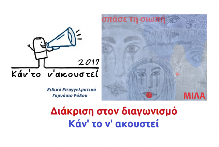 ΔΕΛΤΙΟ ΤΥΠΟΥ-ΘΕΜΑ: Σημαντική διάκριση του Ειδικού Επαγγελματικού Γυμνασίου Ρόδου Σημαντική διάκριση απέσπασε η συμμετοχή του Ειδικού Επαγγελματικού Γυμνασίου την Παρασκευή 17 Μαρτίου 2017 στον διαγωνισμό "Καν' το ν' ακουστεί" του European SchoolRadio στα πλαίσια του 4ου Φεστιβάλ Μαθητικού Ραδιοφώνου, που πραγματοποιήθηκε στο Ρέθυμνο. Στην τελετή απονομής των βραβείων η συμμετοχή του σχολείου μας διακρίθηκε αποσπώντας έπαινο από τους διοργανωτές. Η σημαντικότερη,όμως, επιτυχία του μηνύματος των παιδιών ήταν ότι στην ψηφοφορία του κοινού για το καλύτερο ραδιοφωνικό μήνυμα επί συνόλου 132 συμμετοχών από όλη την Ελλάδα και Κύπρο ήρθαμε πρώτοι στην προτίμησή σας με 4463 "καρδούλες", ενώ πήραμε την δεύτερη θέση στο σύνολο των 225 συμμετοχών και των 2 κατηγοριών (τραγούδι & ραδιοφωνικό μήνυμα). Ευχαριστούμε θερμά όλους εσάς που ακούσατε το μήνυμα των παιδιών και μας στηρίξατε σε όλη αυτή την πορεία. Λίγα λόγια για την δημιουργία του μηνύματος: Η προετοιμασία και η δημιουργία του Ραδιοφωνικού μηνύματος «Σπάσε τη σιωπή» προήλθε από την εποικοδομητική συνεργασία μαθητών εκπαιδευτικών και ειδικού εκπαιδευτικού προσωπικού του Ειδικού Επαγγελματικού Γυμνασίου Ρόδου.Τα στάδια υλοποίησής του διαμορφώθηκαν από την δυναμική της ομάδας σε δύο πυλώνες ως εξής: Διαμόρφωση συναισθημάτων και Βιωματική προσέγγιση. Η διαμόρφωση συναισθημάτων περιελάμβανε τα παρακάτω βήματα: Αρχικά, όλοι οι συμμετέχοντες άκουσαν το τραγούδι«The Sound of Silence» των Simon&Garfunkel και διατύπωσαν τα συναισθήματα που τους προκάλεσε το άκουσμα του τραγουδιού.Στη συνέχεια, τους διανεμήθηκαν οι στίχοι του τραγουδιού μεταφρασμένοι στα Ελληνικά για τον εντοπισμό συναισθηματικής ταύτισης τραγουδιού και στίχων. Έπειτα, δόθηκε στους μαθητές το ποίημα«Σώπα μη μιλάς» του ΑζίζΝεσίν ,μία διαφορετική προσέγγιση της σιωπής.Εκφράστηκαν διαλογικά οι απόψεις και οι σκέψεις των μαθητών, όπως τελικά διαμορφώθηκαν. Κατά τη Βιωματική προσέγγιση σχηματίστηκε ο κύκλος της σιωπής από μαθητές και εκπαιδευτικούς, ενώ μοιράστηκαν καρτέλες με αναγραφόμενα διαφορετικά συναισθήματα.Ακολούθησε παντομίμα, όπου ο κάθε μαθητής περιέγραψε με τη γλώσσα του σώματός του το συναίσθημα της καρτέλας του. Τέλος οι μαθητές διατύπωσαν τι σημαίνει για τον κάθε ένα η σιωπή και αν αυτή η θεώρηση άλλαξε μετά την παραπάνω δραστηριότητα. Οι σκέψεις και τα συναισθήματα των μαθητών κατεγράφησαν και αποτέλεσαν την έμπνευση και τον κορμό του Ραδιοφωνικού τους μηνύματος, το οποίο ντύθηκε μουσικά με το τραγούδι «The Sound of Silence» των Simon&Garfunkel . Μέσα από το μήνυμά τους τα παιδιά συμφώνησαν ότι η σιωπή πρέπει να σπάσει καιμας προτρέπουν να μιλήσουμε, να επικοινωνήσουμε, για να αλλάξουμε τον κόσμο! Για να γίνει το όνειρο πραγματικότητα: Έλαβαν μέρος οι μαθητές : η Μαρία Σ., ο Ιωάννης Κρ., Σερκάν Α., Κωνσταντίνος Σ.,Πανορμίτης Π., Φεράτ Τ., Ευγένιος Α. Αναστάσιος Τ. Ιωάννης Κ.. Οι φωνές του Ραδιοφωνικού μηνύματος είναι των μαθητών: Ευγένιου Α., Μαρίας Σ. και Ιωάννη. Η αφίσα, η οποία συμπλήρωσε εικαστικά το Ραδιοφωνικό μήνυμα, φιλοτεχνήθηκε από την μαθήτρια Ειρήνη Μπ. Εμψυχωτές και συντονιστές της δράσηςήταν οι εκπαιδευτικοί: κα Κασσωτάκη Μαρία, κα Κωνσταντακοπούλου Κωνσταντίνα, κα Μπόνη Ειρήνη και κα Ράντο Αντωνία. Η τεχνική επιμέλεια έγινε από τον Διευθυντή του σχολείου κ. Χριστινάκη Βασίλη και την εκπαιδευτικό κα Κωνσταντίνα Κωνσταντακοπούλου.