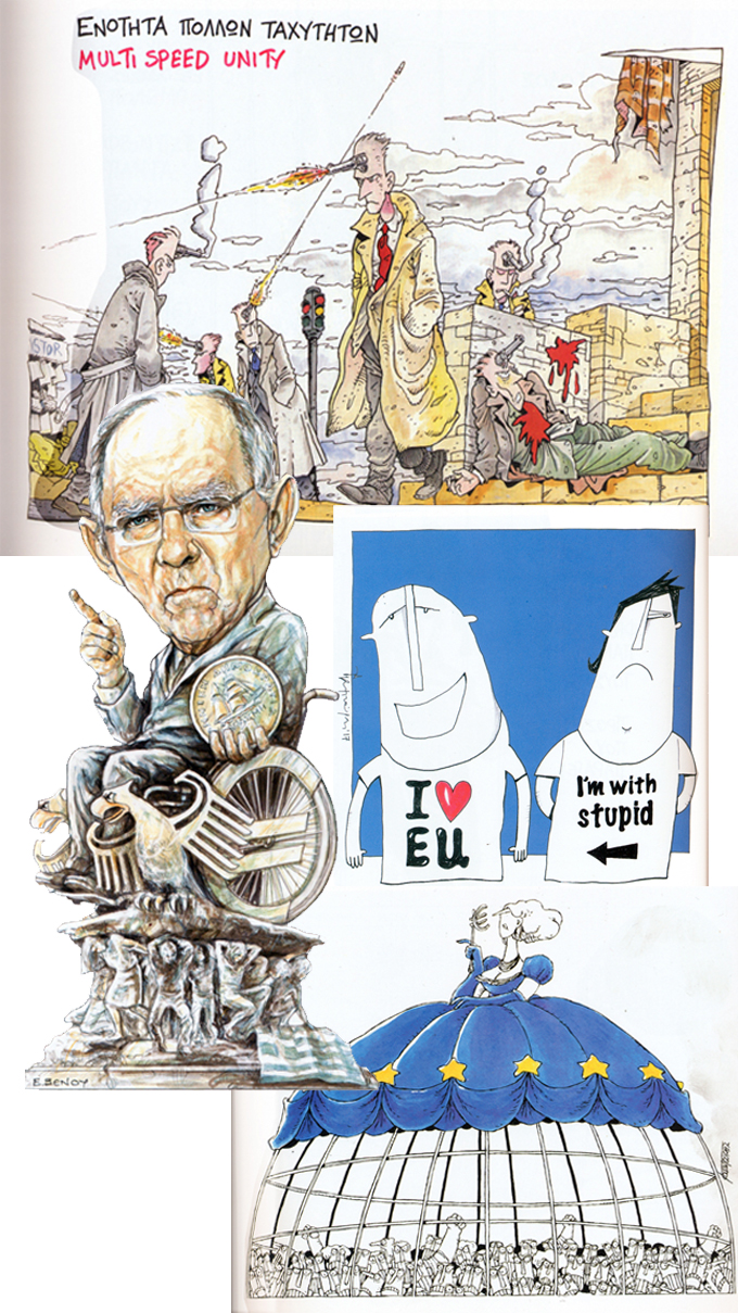 Είναι Παρασκευή βράδυ και μόλις επέστρεψα μετά απο τέσσερις μέρες στην Αθήνα, όπου παραβρέθηκα στα εγκαίνια της έκθεσης γελοιογραφίας “Γλυκειά Ευρώπη”. Στην έκθεση μετείχαν 29 Έλληνες και 28 Βρετανοί σκιτσογράφοι, γνωστοί επαγγελματίες του είδους όλοι τους. Τεράστια ήταν η ανταπόκριση του κοινού, με χιλιάδες επισκέπτες, πολλοί απο τους οποίους ξένοι. Τα θετικά και επαινετικά χειρόγραφα σχόλια στο βιβλίο επισκεπτων καθώς και όσα ειπώθηκαν σε προσωπικές συζητήσεις μαρτυρούν την ποιότητα και την εντύπωση που προκάλεσε η έκθεση. Μικρή μερίδα του τύπου δημοσίευσε αρνητικά έως και υποτιμητικά σχόλια για έκθεση και εκθέτοντες, ενοχλημένη αφ’ ενός από την σκληρή κριτική που πολλά σκίτσα ασκούν στην Ευρώπη και αφ’ ετέρου απο το γεγονός ότι εκτός απο την Περιφέρεια Αττικής, Το Μορφωτικό Ιδρυμα της ΕΣΗΕΑ και την ΣΤΑΣΥ συνδιοργανωτής ήταν και η Βουλή των Ελλήνων, ενω τα εγκαίνια έγιναν απο τον Πρόεδρο της Βουλής,. Είναι αργά τώρα για να σχολιάσω τα σχόλια. Θα τα κάνω όμως αύριο. Για την ώρα παραθέτω την απάντηση της Λέσχης Ελλήνων Γελοιογράφων. Α και, στην τυχη, κάποια απο τα ενοχλητικά σκίτσα: του ΣΤΑΘΗ, της Εφης Ξένου, της Μαριας Τζαμπούρα και του Μιχάλη Κουντούρη….