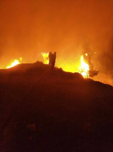 Μια ακόμη δύσκολη νύχτα για τις επίγειες δυνάμεις δασοπυρόσβεσης στον Προφήτη Ηλία. Με προσπάθεια και σθένος κατάφεραν να κρατήσουν το μέτωπο προς Λάερμα ενώ η φωτιά που απειλούσε τις κεραίες ελέγχθηκε. Μιλώντας το Verena.gr πριν απο λίγο με τον διοικητή της ΠΥΡ Νικήτα Βενιό η εικόνα που μας μετέφερε είναι οτι "υπάρχει ύφεση σε όλα τα μέτωπα αλλά για πόσο"... "Το έδαφος καίει" ανέφερε ο κ. Βενιός και σημείωσε οτι η προσπάθεια συνεχίζεται. Ηδη ολα τα εναέρια μέσα έχουν μπει με το πρώτο φως της ημέρας στην κατάσβεση της φωτιάς και εκφράζεται η αισιοδοξία οτι ίσως η σημερινή μερα να είναι καλύτερη απο τη χθεσινή. Οι φώτο είναι χθες το βράδυ απο το μέτωπο προς Λάερμα με δυο πυροσβέστες μέσα στις φλόγες να μάχονται για την κατάσβεση της.