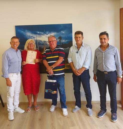 Τέλος, ο κ. Βυρίνης βράβευσε τον Έλληνα George Alexiou και τη σύζυγο του Bente από τη Δανία, όπου ζει το ζευγάρι από το 1968 και έχουν επισκεφθεί το νησί 20 φορές, μένουν δε στο Mimoza Hotel.