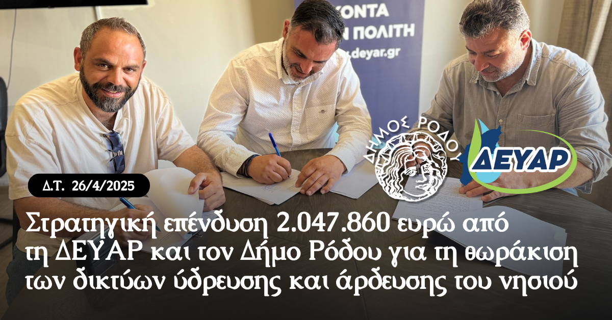 Υπεγράφη την Τετάρτη 23 Απριλίου 2025 από τη ΔΕΥΑΡ σε συνεργασία με τον Δήμο Ρόδου η εργολαβική σύμβαση για το μεγάλο έργο «Λειτουργία – Επισκευή και Συντήρηση Δικτύων Ύδρευσης – Άρδευσης Νήσου Ρόδου», προϋπολογισμού 2.047.860 ευρώ.