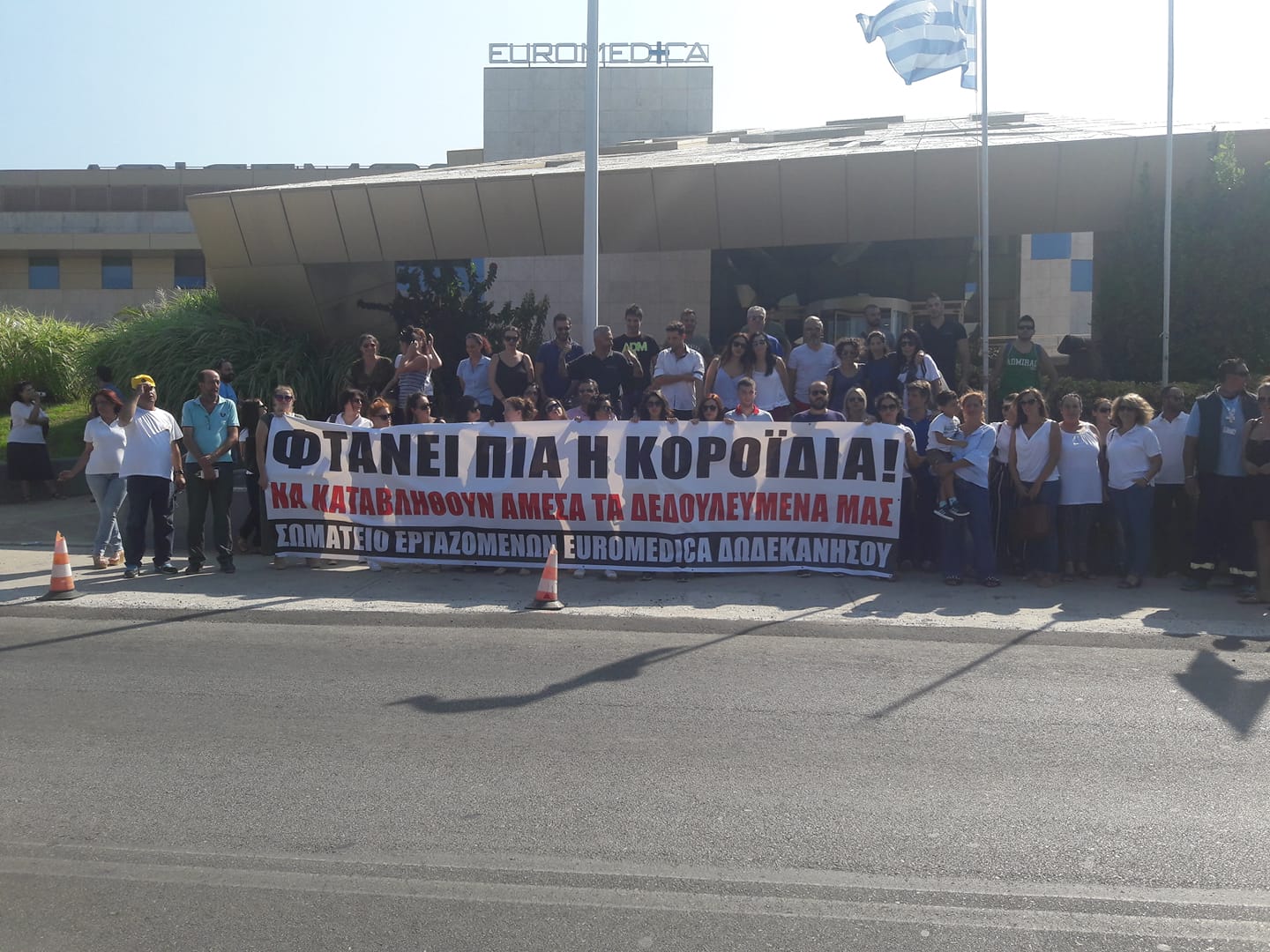 Σε συγκέντρωση διαμαρτυρίας προχώρησαν σήμερα οι εργαζόμενοι στη Γενική Κλινική EUROMEDICA ΔΩΔΕΚΑΝΉΣΟΥ διεκδικώντας δεδουλευμένα μηνών.Η διαμαρτυρία έγινε με τη στήριξη της διοίκησης του Εργατικού Κέντρου Ρόδου.Ο πρόεδρος του Ε.Κ.Ρ Σάββας Χατζησάββας έγραψε πριν απο λίγο στη σελίδα του στο facebook: "Δυναμική αγωνιστική και μαζική η συγκέντρωση διαμαρτυρίας των εργαζομένων στη Γενική Κλινική EUROMEDICA ΔΩΔΕΚΑΝΉΣΟΥ σήμερα 27 Ιουλίου. Η υπομονή των εργαζομένων έχει εξαντληθεί. Το Εργατικό Κέντρο Ρόδου θα είναι δίπλα τους μέχρι την τελική νίκη. Ο αγώνας τώρα αρχίζει"!Παρόντες απο το ΕΚΡ. εκτός απο τον πρόεδρο Σάββα Χατζησάββα, ο γενικός γραμματέας Νίκος Τριπολίτης, και το μέλος της διοίκησης Μιχάλης Ροδίτης. Κεντρικό σύνθημα των εργαζομένων ήταν " Φτάνει πια η κοροϊδία. Να εξοφληθούν άμεσα όλα τα δεδουλευμένα".