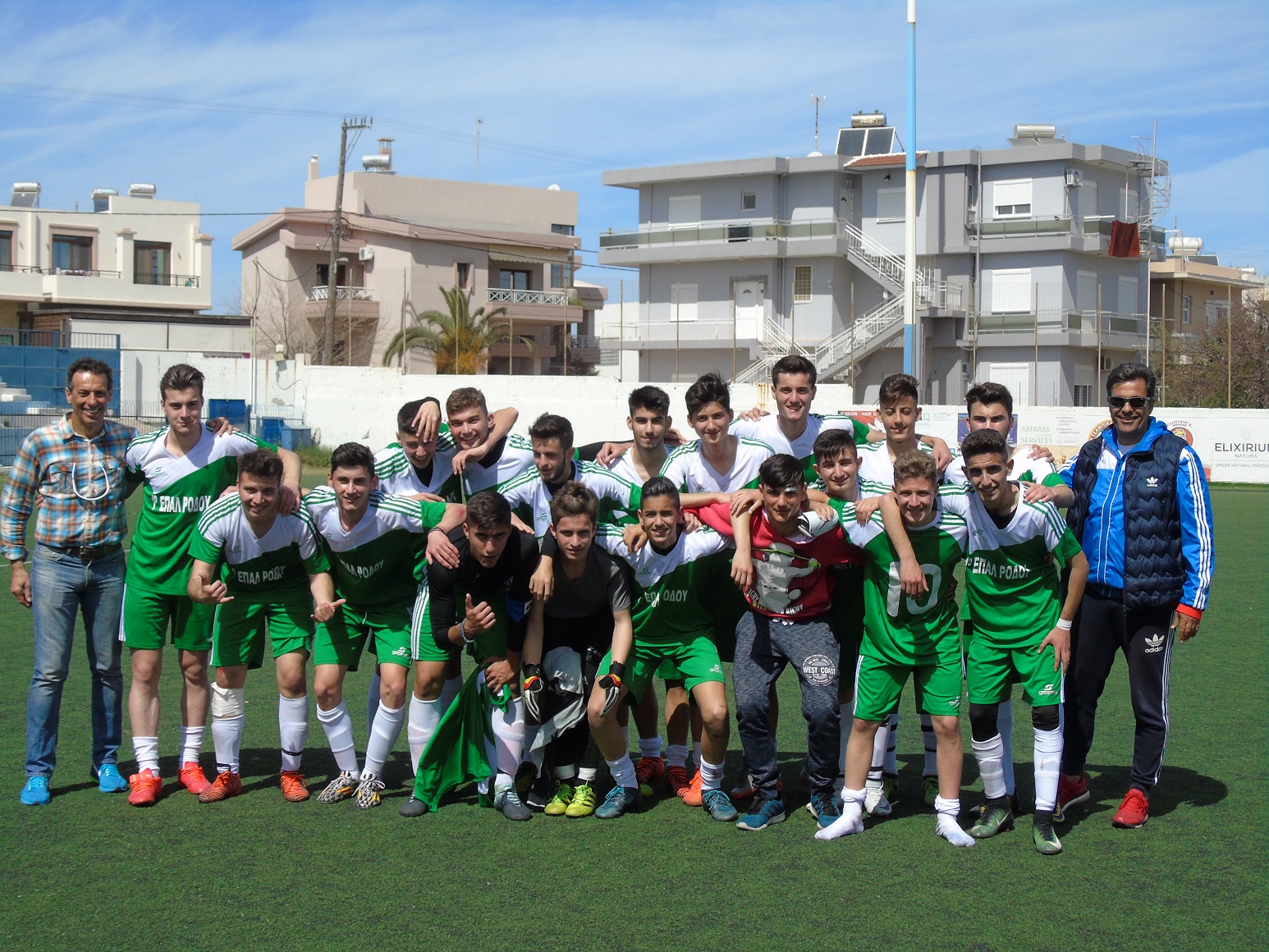ΕΛΛΗΝΙΚΗ ΔΗΜΟΚΡΑΤΙΑ ΥΠΟΥΡΓΕΙΟ ΠΑΙΔΕΙΑΣ, ΕΡΕΥΝΑΣ ΚΑΙ ΘΡΗΣΚΕΥΜΑΤΩΝ ΠΕΡ/ΚΗ Δ/ΝΣΗ Α/ΘΜΙΑΣ & Β/ΘΜΙΑΣ ΕΚ/ΣΗΣ Ν. ΑΙΓΑΙΟΥ Δ/ΝΣΗ Β/ΘΜΙΑΣ ΕΚΠ/ΣΗΣ ΔΩΔΕΚΑΝΗΣΟΥ 1ο ΕΠΑ.Λ ΡΟΔΟΥ-ΘΕΜΑ : Ο σύλλογος διδασκόντων και ο Διευθυντής του 1ου ΕΠΑ. Λ. Ρόδου συγχαίρουν την ποδοσφαιρική ομάδα του σχολείου για τη σπουδαία νίκη στον τελικό Δωδεκανήσου την Τετάρτη 21/3/2018, όπου επικράτησαν του 1ου ΓΕΛ Καλύμνου με σκορ 4 -1. Διεξήχθη ένας ενδιαφέρων αγώνας στο γήπεδο Κοσκινού σε αθλητικά πλαίσια και είχαν την ευκαιρία να τον παρακολουθήσουν οι μαθητές του σχολείου, οι οποίοι δημιούργησαν μια ωραία ατμόσφαιρα ενισχύοντας τις προσπάθειες των συμμαθητών τους. Στο γήπεδο συμπαραστάτες ήταν και αρκετοί εκπαιδευτικοί του σχολείου, ενώ βοήθησαν και οι καλές καιρικές συνθήκες. Τα μέλη της ομάδας: Προπονητής: ΚΑΜΠΟΥΡΗΣ ΙΩΑΝΝΗΣ