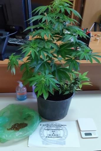 α) από αστυνομικούς του Αστυνομικού Τμήματος Ηρακλειδών Κω, 29χρονος ημεδαπός γιατί έπειτα από έρευνα που έγινε στην κατοικία του βρέθηκαν κάνναβη ακατέργαστη βάρους -13- γραμμ., μια ζυγαριά ακριβείας και δυο δενδρύλλια κάνναβης που καλλιεργούσε μέσα σε γλάστρα. (επισυνάπτεται φωτογραφία),