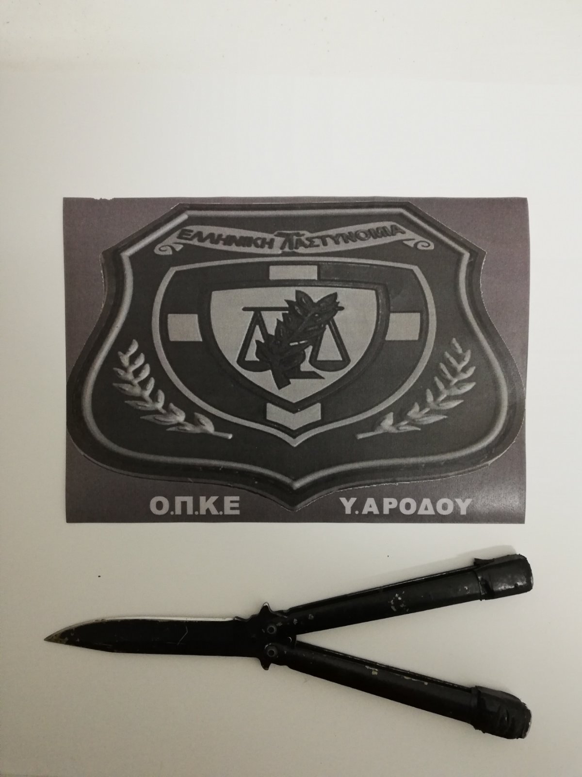 Σύλληψη ημεδαπού για οπλοκατοχή στη Ρόδο-Την 20-02-2024 το απόγευμα συνελήφθη στην Ρόδο, από περιπολούντες αστυνομικούς της Ο.Π.Κ.Ε., 18χρονος ημεδαπός στην κατοχή του οποίου βρέθηκε και κατασχέθηκε μαχαίρι τύπου πεταλούδα, με λάμα -9- εκατοστά.