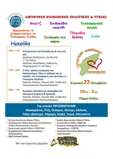 δελτίο τύπου-ΣΥΜΜΕΤΕΧΩ – ΔΙΑΣΚΕΔΑΖΩ – ΠΡΟΣΦΕΡΩ -Στο πλαίσιο της προσπάθειας της κα. Άννας Ζωάννου, αντιδημάρχου Κοινωνικής Πολιτικής, Ισότητας των φύλων, Τρίτης ηλικίας, Αμεα και Εθελοντισμού, του Κέντρου Κοινότητας και της Διεύθυνσης Κοινωνικής Πολιτικής και Υγείας του Δήμου Ρόδου, να βελτιωθούν οι συνθήκες διαβίωσης των πολιτών, διοργανώνεται την Κυριακή 22 Οκτωβρίου από τις 10π.μ μέχρι τις 2μ.μ, η εκδήλωση ΣΥΜΜΕΤΕΧΩ – ΔΙΑΣΚΕΔΑΖΩ – ΠΡΟΣΦΕΡΩ. Για πρώτη φορά διεξάγονται παράλληλα δράσεις σε 7 διαφορετικά μέρη του νησιού (Ροδίνι, Καλυθιές, Λίνδος, Αρχάγγελος, Παραδείσι, Λάερμα και Νότια Ρόδος).