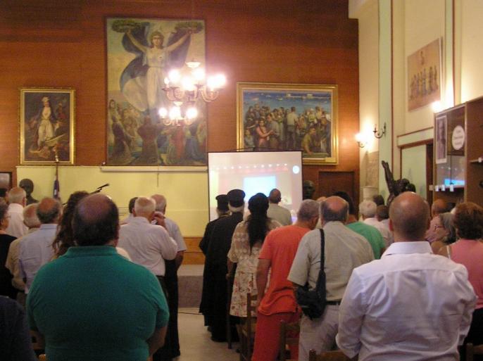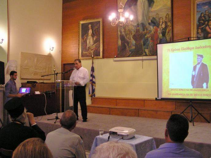 Ακολούθησε μια μικρή παρουσίαση από το μέλος μας κ. Ευδοξία Τσουγκράνη, σχετικά με τις δράσεις της Πολιτιστικής Ομάδας “Αρχιπέλαγος” , στα πλαίσια των εκδηλώσεων για τα “70 Χρόνια Ελεύθερα Δωδεκάνησα” και στην συνέχεια έγινε η προβολή του βιογραφικού ντοκυμαντέρ “Μία Απίστευτος Ζωή” για τον Μεγάλο Αγωνιστή . Εν συνεχεία ο ιατρός- Καθηγητής του Πανεπιστημίου Αθηνών κ. Σακελλάριος Καρπάθιος, ανέλυσε λεπτομερώς την προσωπικότητα του Δρος Σκεύου Ζερβού, με ταυτόχρονη προβολή διαφανειών. Η εκδήλωση ολοκληρώθηκε με την προβολή αποσπάσματος από την επετειακή εκδήλωση της Πολιτιστικής Ομάδας “Αρχιπέλαγος” στο Πολεμικό Μουσείο Αθηνών , κατά την οποία η μπάντα του Πολεμικού Ναυτικού παιάνισε (για πρώτη φορά από στρατιωτική μπάντα) τον Ύμνο των Δωδεκανήσων. Η ατμόσφαιρα φορτισμένη από συγκίνηση και όλοι οι παρευρισκόμενοι τον παρακολούθησαν σε στάση προσοχής !