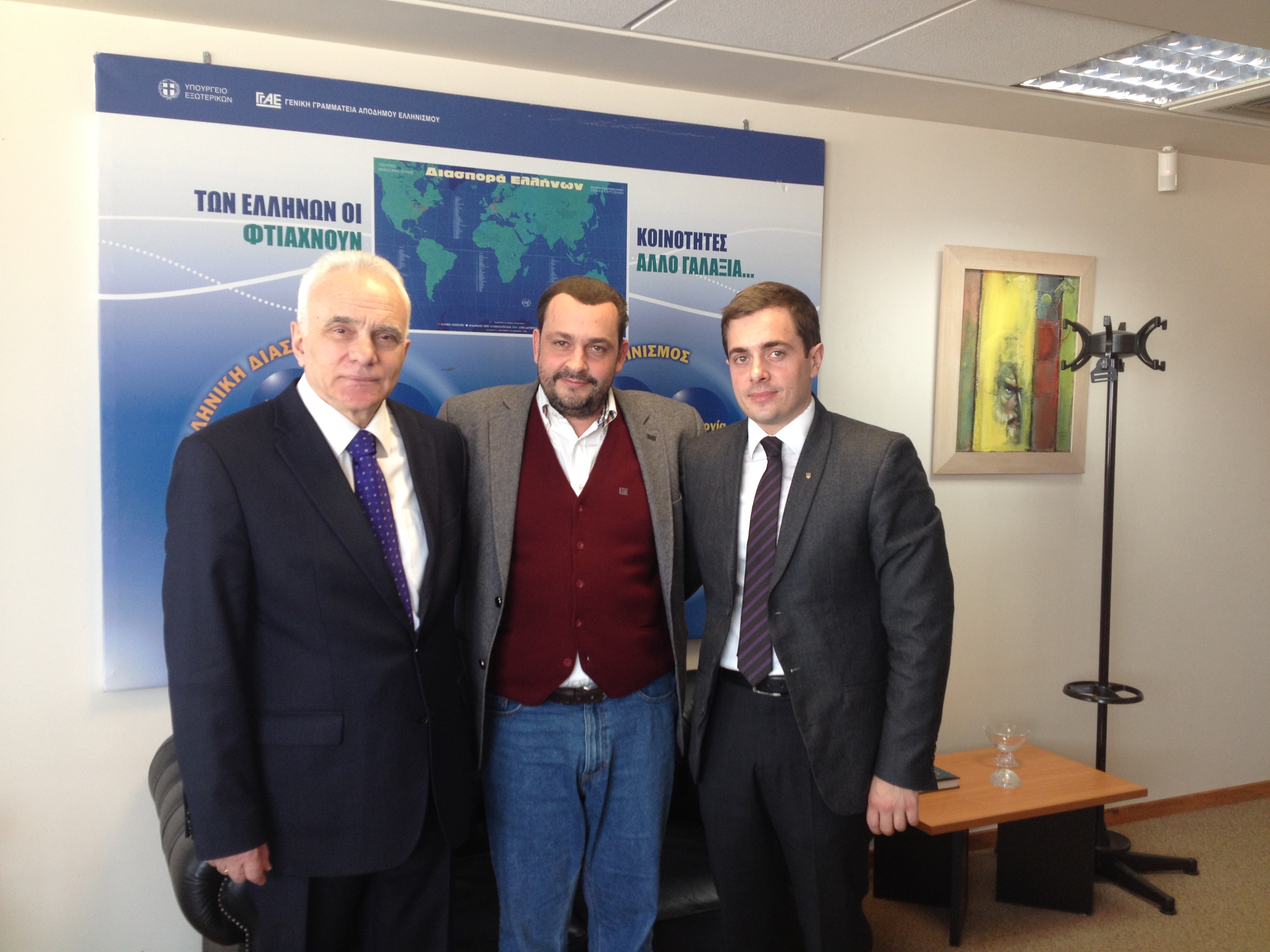 Συνάντηση του Επικεφαλής της Γενικής Γραμματείας Αποδήμου Ελληνισμού Μιχάλη Κόκκινου με την ηγεσία του Κρατικού Πανεπιστημίου Μαριούπολης Ουκρανίας για το «Έτος Νίκου Καζαντζάκη» 2017 -Οι δράσεις πολιτισμού, οι οποίες θα διοργανωθούν για το «Έτος Νίκου Καζαντζάκη» 2017 από το Κρατικό Πανεπιστήμιο Ανθρωπιστικών Σπουδών της Μαριούπολης Ουκρανίας, σε συνεργασία με τον Ελληνισμό της Ουκρανίας, υπό την επίβλεψη της Γενικής Γραμματείας Αποδήμου Ελληνισμού, βρέθηκαν στο επίκεντρο της συνάντησης της ηγεσίας της Γενικής Γραμματείας Αποδήμου Ελληνισμού με την ηγεσία του Κρατικού Πανεπιστημίου Ανθρωπιστικών Σπουδών Μαριούπολης. Η συνάντηση έλαβε χώρα στο Υπουργείο Εξωτερικών, στην έδρα της ΓΓΑΕ, την Τετάρτη 5 Απριλίου και συμμετείχαν από πλευράς ΓΓΑΕ ο Επικεφαλής Μιχάλης Κόκκινος και από πλευράς ηγεσίας του Πανεπιστημίου οι κκ. Κωνσταντίνος Μπαλαμπάνοφ, Πρύτανης του Πανεπιστημίου και επίτιμος πρόξενος της Κύπρου στη Μαριούπολη, Μίκολα Τροφιμένκο Αντιπρύτανης του Πανεπιστημίου.