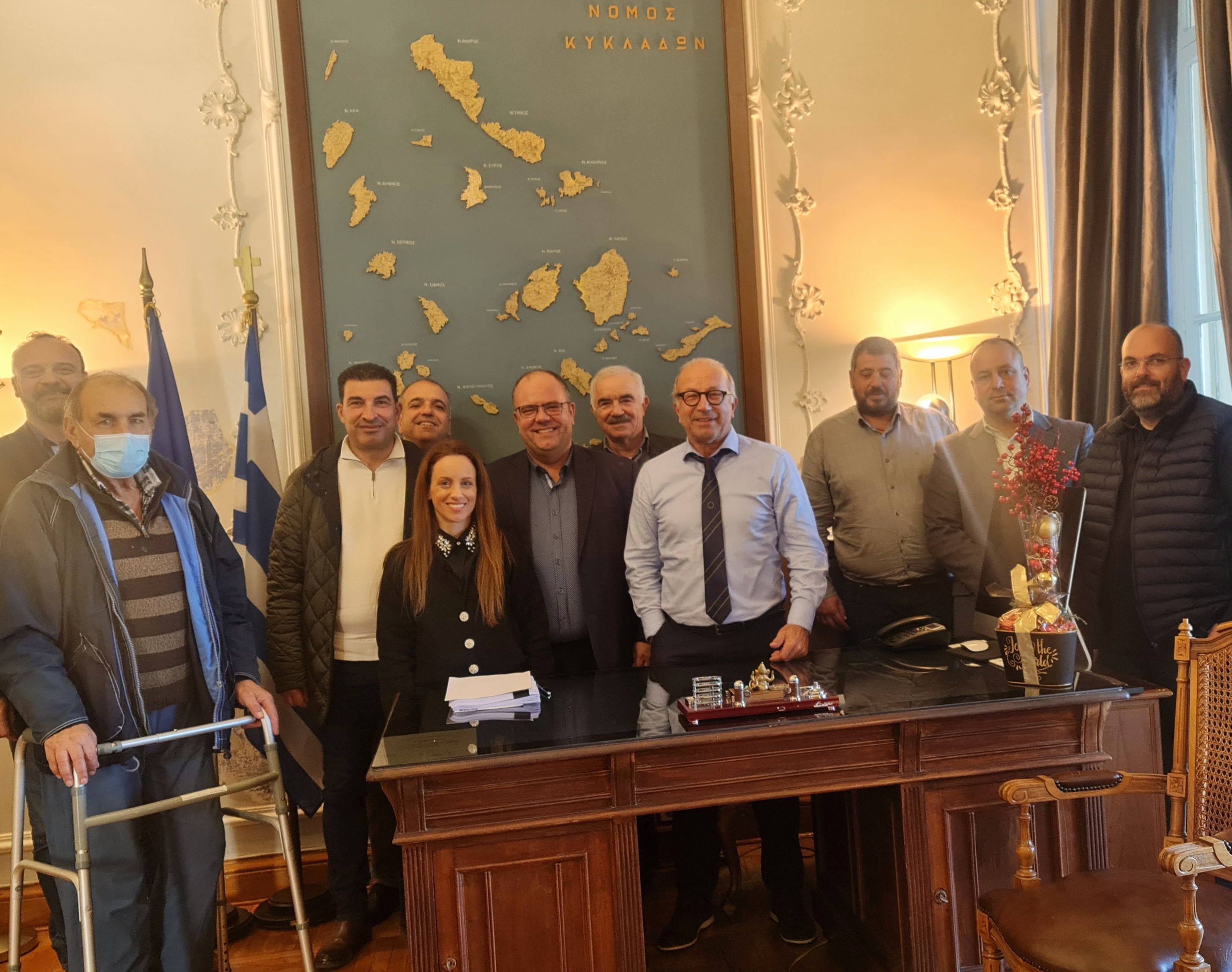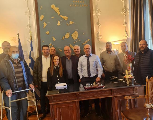 Ο Χωρικός Αντιπεριφερειάρχης Κυκλάδων κ. Γ. Λεονταρίτης υποδέχθηκε σήμερα, Παρασκευή 5 Ιανουαρίου 2024, στο γραφείο του, τον νεοεκλεγέντα Δήμαρχο Σύρου – Ερμούπολης κ. Αλέξη Αθανασίου, ο οποίος συνοδευόταν από τους νεορισθέντες Αντιδημάρχους, τον Πρόεδρο του Δημοτικού Συμβουλίου, τον Πρόεδρο του Δημοτικού Λιμενικού Ταμείου, τον Πρόεδρο της Δημοτικής Επιχείρησης Ύδρευσης Αποχέτευσης Σύρου και Εντεταλμένους Συμβούλους του Δήμου.