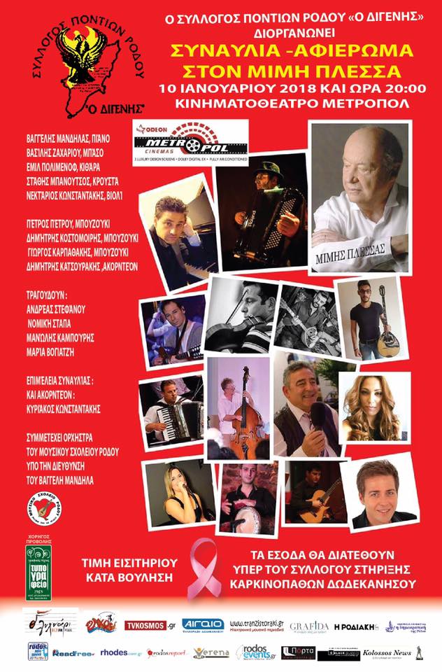 Ένα μοναδικό μουσικό αφιέρωμα – συναυλία στο σπουδαίο συνθέτη Μίμη Πλέσσα διοργανώνει ο Σύλλογος Ποντίων Ρόδου «Ο Διγενής» την Τετάρτη 10 Ιανουαρίου στις 8.00μμ στο κινηματοθέατρο Μετροπόλ με την συμμετοχή πολλών καταξιωμένων Ροδίων καλλιτεχνών. Η τιμή του εισιτηρίου είναι ΚΑΤΑ ΒΟΎΛΗΣΗ. Και τα έσοδα θα διατεθούν υπέρ του Συλλόγου Στήριξης Καρκινοπαθών Δωδεκανήσου. Επιμέλεια Συναυλίας: Κυριάκος Κωνσταντάκης Συμμετέχουν οι μουσικοί: Κυριάκος Κωνσταντάκης-Ακορντεόν Βαγγέλης Μάνδηλας-Πιάνο Βασίλης Ζαχαρίου-Μπάσο ΕμίλΠολιμένοφ-Κιθάρα Στάθης Μπανούτσος-Κρουστά Νεκτάριος Κωνσταντάκης-Βιολί Πέτρος Πέτρου-Μπουζούκι Δημήτρης Κωστομοίρης-Μπουζούκι Γιώργος Καρπαθάκης-Μπουζούκι Δημήτρης Κατσουράκης- Ακορντεον Τραγουδούν: Ανδρέας Στεφάνου Νομική Στάππα Μανώλης Καμπούρης Μαρία Βογιατζή Συμμετέχει η ορχήστρα του μουσικού σχολείου Ρόδου υπο την διεύθυνση του Βαγγέλη Μάνδηλα ΣΤΗΡΙΖΟΥΜΕ ΟΛΟΙ ΜΑΖΙ ΤΗΝ ΜΟΥΣΙΚΗ ΤΟΝ ΠΟΛΙΤΙΣΜΟ ΤΟΝ ΣΥΝΑΝΘΡΩΠΟ!!