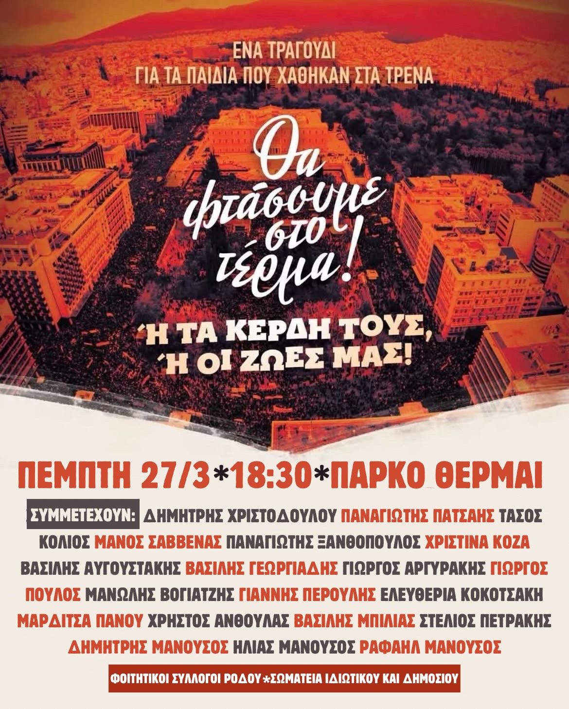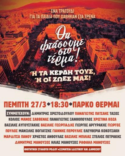 Δεν θα επιτρέψουμε το έγκλημα να συγκαλυφθεί, θα πάμε τον αγώνα μέχρι το τέρμα  όπως λέει και το σύνθημα της συναυλίας μας, γιατί αντλούμε δύναμη από τα μεγαλειώδη συλλαλητήρια που πλημμύρισαν και την πόλη μας, από τον αγώνα που δίνουμε εδώ και δύο χρόνια και έχει ως αποτέλεσμα να πέσουν οι μάσκες και να αποκαλυφθεί η σαπίλα, να αποκαλυφθούν οι ένοχοι, η κυβέρνηση και τελικά αυτή η χούφτα από παράσιτα που έχουν τα τρένα, τα αεροπλάνα, τα λιμάνια και δεν δίνουν δεκάρα για την ανθρώπινη ζωή παρά μόνο για την κερδοφορία.