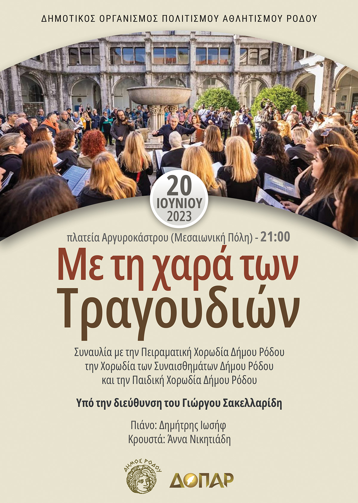 Ο Δημοτικός Οργανισμός Πολιτισμού Αθλητισμού Ρόδου διοργανώνει συναυλία με τίτλο: «Με τη χαρά των τραγουδιών». Η συναυλία θα πραγματοποιηθεί την Τρίτη 20 Ιουνίου 2023, στις 21:00 στην Πλατεία Αργυροκάστρου που βρίσκεται στην Μεσαιωνική Πόλη όπως πηγαίνουμε για το Αρχαιολογικό Μουσείο.