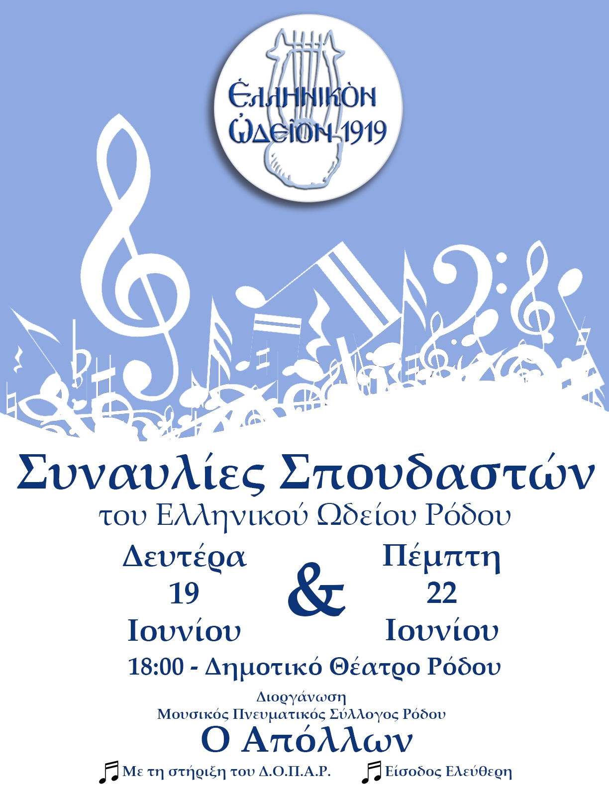 ΔΕΛΤΙΟ ΤΥΠΟΥ-Συναυλίες του Ελληνικού Ωδείου Ρόδου -Στις 19 και 22 Ιουνίου 2017, στο Δημοτικό Θέατρο Ρόδου, στις 6μ.μ. οι σπουδαστές του Ελληνικού Ωδείου κλείνουν με τον πιο μουσικό τρόπο τη σχολική τους χρονιά . Διοργάνωση Μουσικός και Πνευματικός Σύλλογος ΑΠΟΛΛΩΝ. Με τη στήριξη του Δήμου Ρόδου – Δ.Ο.Π.Α.Ρ. Είσοδος Ελεύθερη.