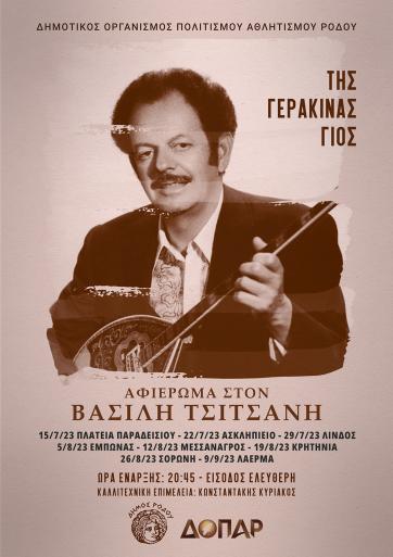 Ο ΔΟΠΑΡ και ο Δήμος Ρόδου, στο πλαίσιο του πολιτιστικού προγράμματος «Καλοκαίρι 2023», πραγματοποιούν συναυλίες – αφιέρωμα στον Βασίλη Τσιτσάνη με τίτλο «Της Γερακίνας Γιος» στις δημοτικές ενότητες του νησιού μας. Συγκεκριμένα: