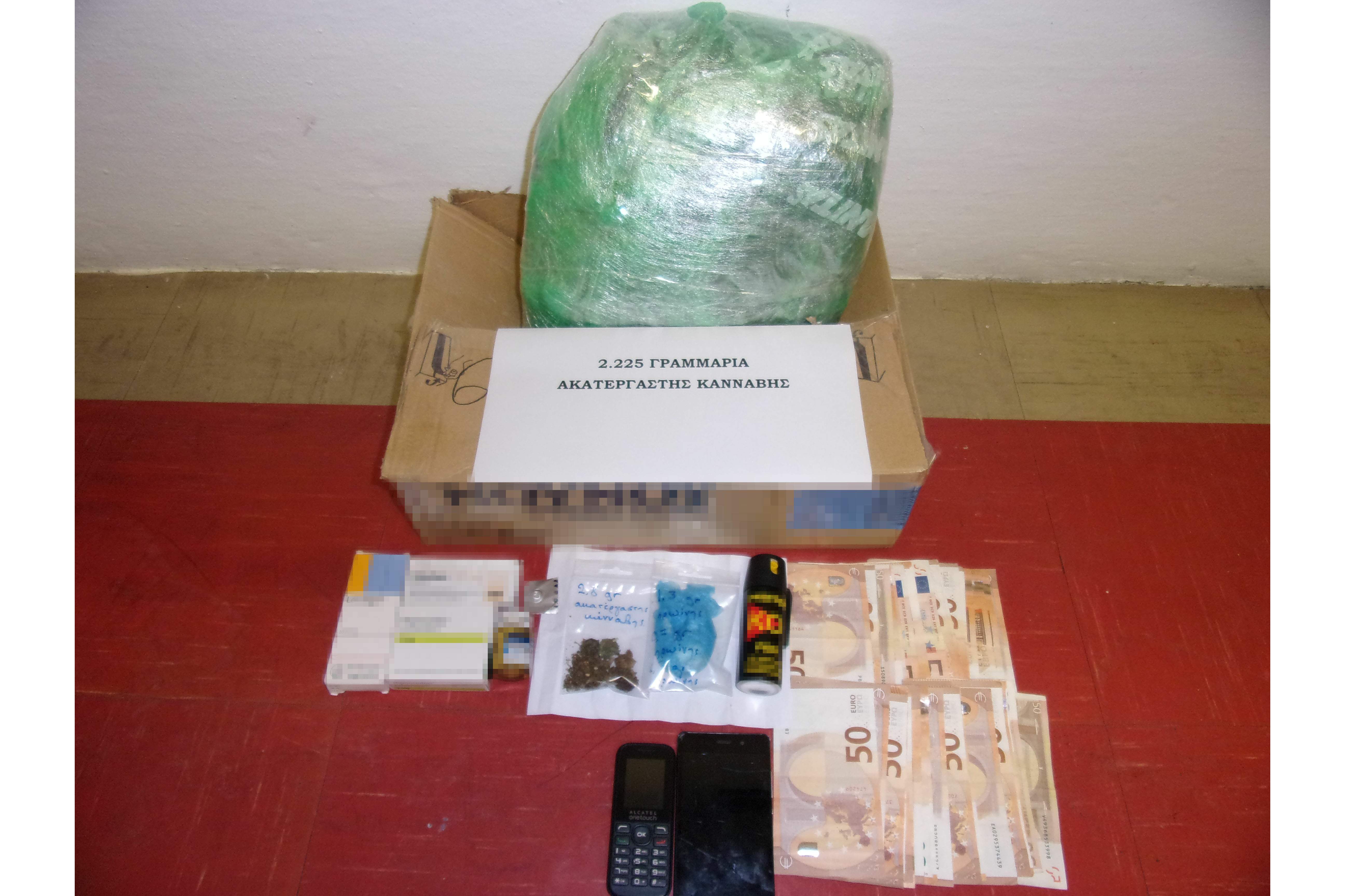 Από το έλεγχο που έγινε στο όχημά του (Ι.Χ.Ε. αυτοκίνητο) εντοπίσθηκε ένα χαρτοκιβώτιο (δέμα) μέσα στο οποίο υπήρχε πλαστική συσκευασία που περιείχε ακατέργαστη κάνναβη βάρους -2- κιλών και 225 γραμμαρίων.