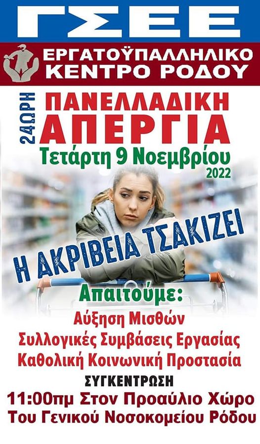 Η Κυβέρνηση είναι απαραίτητο να πάρει άμεσα αποφάσεις ώστε να μπορεσει ο κόσμος να επιβιώσει.  Για όλα τα παραπάνω το Σωματειο ξενοδοχουπαλλήλων Ρόδου αποφάσισε να στηριξει την 24ωρη Πανελλαδικη απεργια που προκυρηχθηκε από την ΓΣΕΕ για την Τετάρτη 9 Νοεμβρίου 2022 και να συμμετέχει στην απεργιακη συγκέντρωση που θα πραγματοποιησει το Εργατικο Κέντρο Ρόδου (ΕΚΡ) στις 11:00 πμ στον προαύλιο χώρο του Γενικού Νοσοκομείου Ρόδου.