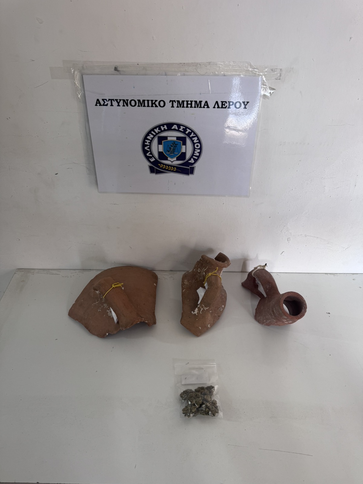 Σύλληψη αλλοδαπού για κατοχή ναρκωτικών και αρχαιοτήτων στη Λέρο-Την 27-11-2025 το απόγευμα συνελήφθη στη Λέρο, από αστυνομικούς του Αστυνομικού Τμήματος Λέρου, 33χρονος αλλοδαπός, διότι στο πλαίσιο αστυνομικής έρευνας βρέθηκαν στην κατοχή του και κατασχέθηκαν -7,8- γραμμάρια ακατέργαστης κάνναβης, καθώς και τρία τμήματα πήλινων αγγείων - αμφορέων, η προέλευση των οποίων ερευνάται