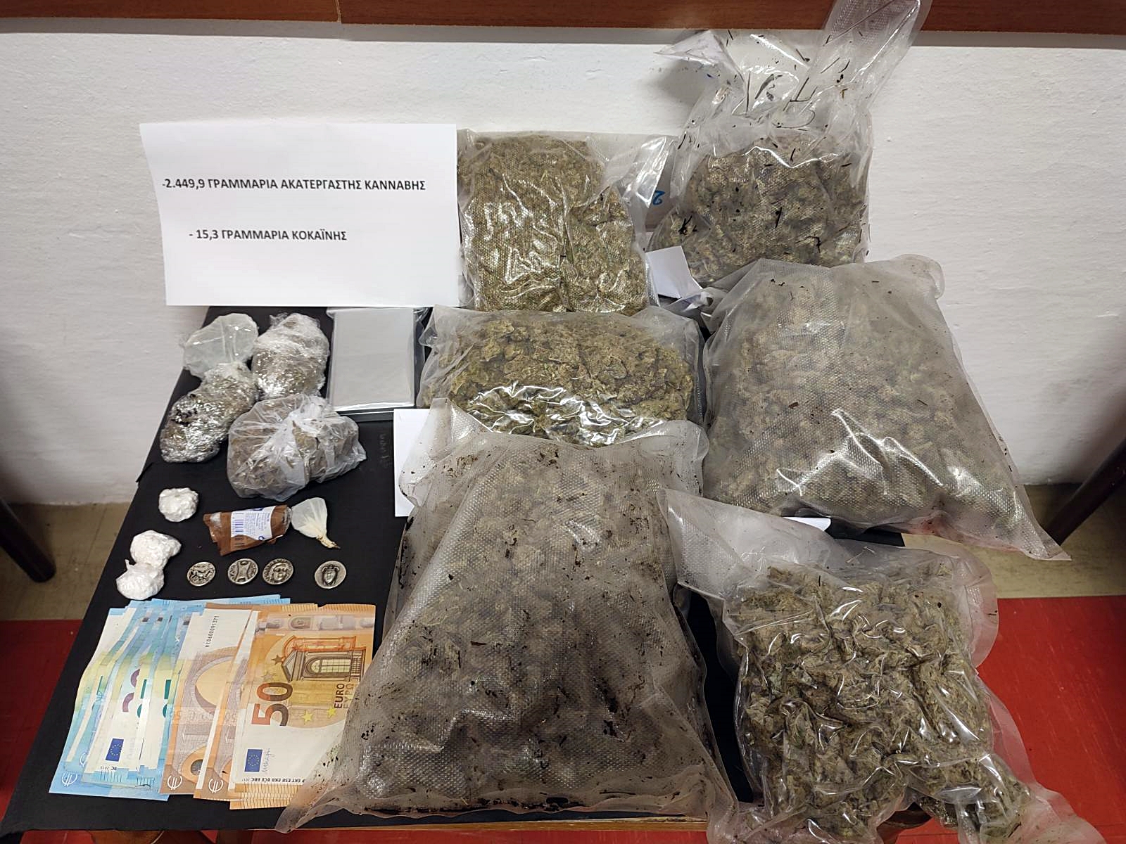 Κατασχέθηκαν -2,45- κιλά κάνναβη, -15- γρ. κοκαΐνη, ζυγαριά ακριβείας, -4- αρχαία νομίσματα, 1.000€