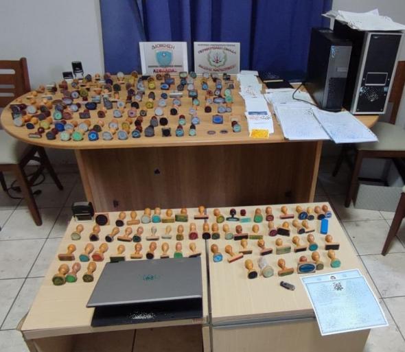 Δύο (02) εξωτερικές μονάδες (Πύργοι) και ένα (01) USB STICK, έντεκα (11) Πιστοποιητικά Διεθνούς Σύμβασης STCW, εβδομήντα τέσσερα (74) Πιστοποιητικά Υπηρεσίας - Certificate of service, διάφορα Πιστοποιητικά επάρκειας – ικανότητας, έγγραφα, έξι (06) απολυτήρια ΕΠΑΛ – γενικού λυκείου, δεκαέξι (16) συνοδευτικά δελτία ταχυμεταφοράς, πλήθος φακέλων από εταιρείες ταχυμεταφορών, πλήθος χειρόγραφων σημειώσεων με ονοματεπώνυμα και ημερομηνίες, τρία (03) σημειωματάρια με ιδιόχειρες σημειώσεις, μία (01) πλαστική σακούλα με πλήθος φωτογραφιών, ένας (01) φορητός υπολογιστής, ενενήντα οχτώ (98) σφραγίδες πλοίων, εννέα (09) σφραγίδες εταιρειών, μία (01) σφραγίδα Λιμενικού Σώματος, τέσσερις (04) σφραγίδες Λιμενικών Αρχών, εννέα (09) λοιπές σφραγίδες, δεκατρείς (13) προσωπικές – ατομικές σφραγίδες, επτά (07) στρογγυλές σφραγίδες προξενείων, μία (01) σφραγίδα δημοτικής αρχής.