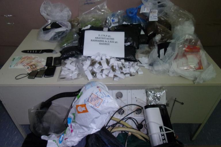 Κατασχέθηκαν ακατέργαστη κάνναβη βάρους 2 κιλών και 780 γρ., καπνός βάρους 2 κιλών και 800 γρ., 28 δενδρύλλια κάνναβης, 13 φυτά καπνού, 3 ζυγαριές ακριβείας κ.α.