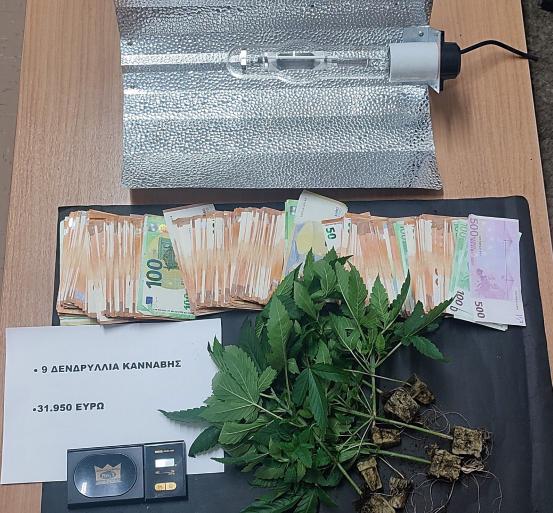 Κατασχέθηκαν 9 φυτά κάνναβης, εξοπλισμός εργαστήριου ελεγχόμενης καλλιέργειας, 31.950€ κ.α.