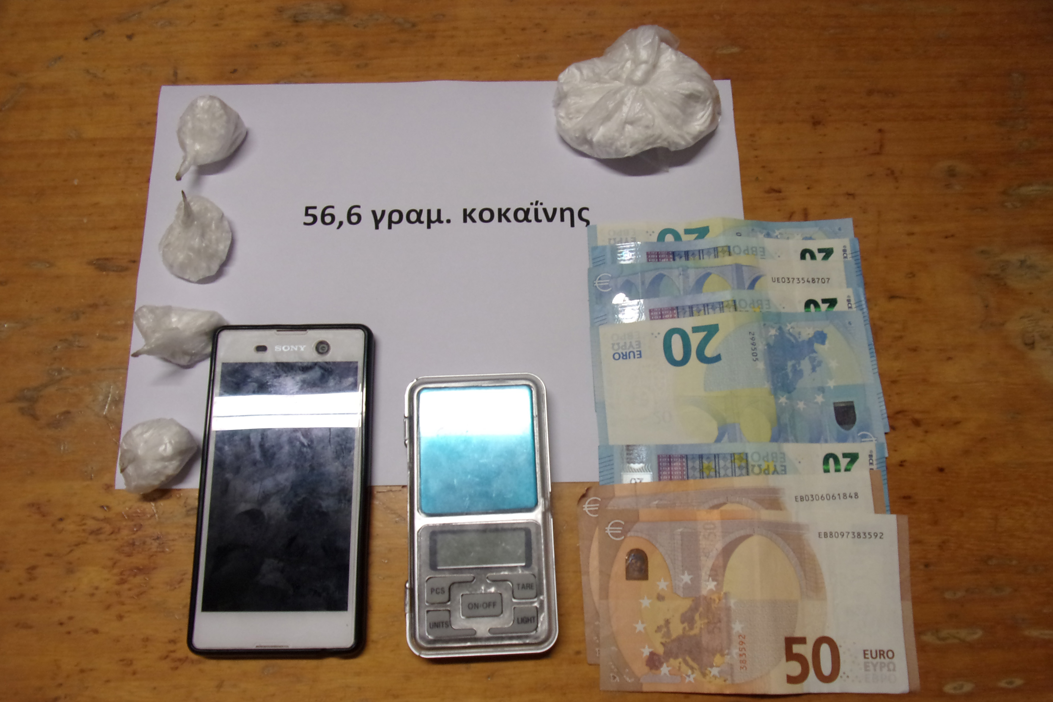 Ειδικότερα, στο πλαίσιο αστυνομικής επιχείρησης σχετικά με διακίνηση ναρκωτικών ουσιών, χθες το απόγευμα πραγματοποιήθηκε έρευνα στην κατοικία του κατηγορούμενου, παρουσία δικαστικού λειτουργού και εκεί βρέθηκαν και κατασχέθηκαν: • Κοκαΐνη συνολικού βάρους -56.6- γραμμαρίων, τοποθετημένη σε -5- πλαστικές συσκευασίες • Ζυγαριά ακριβείας • Παραστατικά ταχυμεταφοράς χρημάτων και σημειωματάριο με χειρόγραφές σημειώσεις χρηματικών ποσών προερχόμενων από συναλλαγές ναρκωτικών • Το χρηματικό ποσό των 220 ευρώ • Κινητό τηλέφωνο