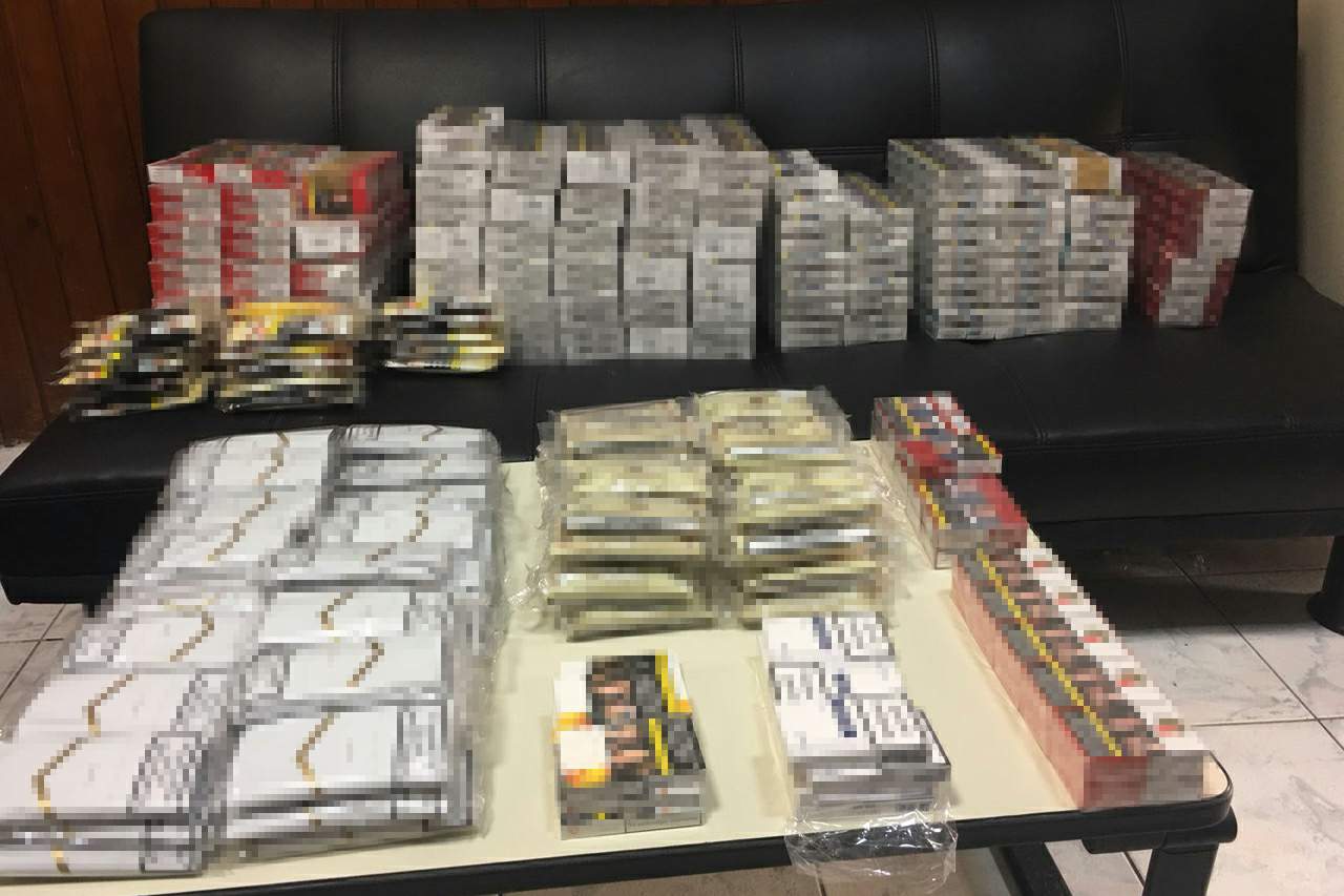 -781- πακέτα τσιγάρων, χωρίς ειδική ταινία φορολόγησης -110- συσκευασίες καπνού συνολικού βάρους -5,5- κιλών, χωρίς ειδική ταινία φορολόγησης Πλήθος ηλεκτρονικών συσκευών και εξαρτημάτων, όπως φορητοί υπολογιστές, κινητά τηλέφωνα, τηλεοράσεις, ηλεκτρικά οικοδομικά εργαλεία, κ.α. Το χρηματικό ποσό των -115- ευρώ -3- σημειωματάρια με χειρόγραφες ενδείξεις αγοραπωλησίας τσιγάρων