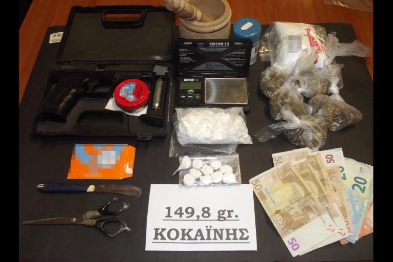 • Κοκαΐνη -9- γραμμαρίων, τοποθετημένη σε ισάριθμες συσκευασίες • Κάνναβη -38,4- γραμμαρίων, τοποθετημένη σε πέντε συσκευασίες • Το χρηματικό ποσό των 150 ευρώ • Αεροβόλο πιστόλι