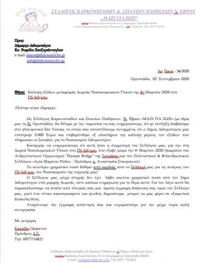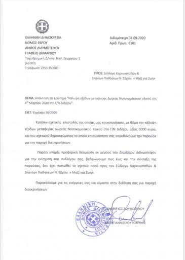 Στο χώρο των φωτογραφιών αναρτούμε τις δυο επιστολές προς αποκατάσταση της αλήθειας, η μία είναι επιστολή του Συλλόγου καρκινοπαθών Εβρου προς τον εκεί δήμαρχο και η δευτερη είναι η απάντηση του δημάρχου που δηλώνει οτι δεν εχει δώσει 3.000 ευρώ στο Σύλλογο Καρκινοπαθών Εβρου