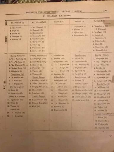 β) Καλύμνου, περιλαμβάνουσα τας νήσους Κάλυμνον, Αστυπάλαιαν, Λειψούς, Λέρον, Πάτμον. Πρωτεύουσα Κάλυμνος.