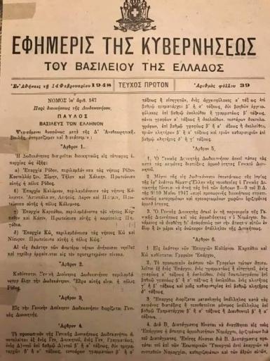 Είναι ο Νόμος υπ’ αριθμόν 547, «Περί διοικήσεως της Δωδεκανήσου» που ψηφίσθηκε από την Δ’ Αναθεωρητική Βουλή των Ελλήνων, και κυρώθηκε από τον τότε βασιλέα Παύλο, στις 11-2-1948.