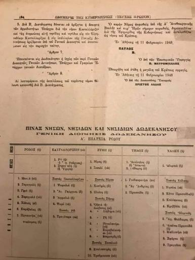 α) πρώτα στο φύλλο 48 της Εφημερίδας της Στρατιωτικής Διοίκησης Δωδεκανήσου 26-7-1947 και στην συνέχεια