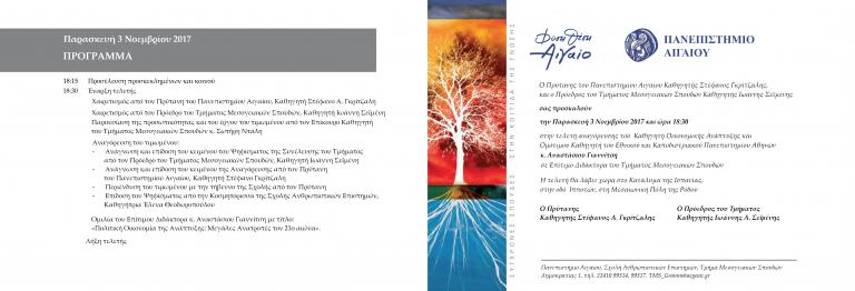 Δελτίο Τύπου -30/10/2017 -Το Τμήμα Μεσογειακών Σπουδών του Πανεπιστημίου Αιγαίου πρόκειται να Αναγορεύσει Επίτιμο Διδάκτορα του Τμήματος τον κ. Αναστάσιο Γιαννίτση, Καθηγητή Οικονομικής Ανάπτυξης και Ομότιμο Καθηγητή του Εθνικού & Καποδιστριακού Πανεπιστημίου Αθηνών, την Παρασκευή 3 Νοεμβρίου 2017 στις 18:30 στο Κατάλυμα της Ισπανίας στη Μεσαιωνική Πόλη της Ρόδου. Η τελετή θα γίνει παρουσία του Πρύτανη του Πανεπιστημίου Αιγαίου, της Κοσμητόρισσας της Σχολής, του Προέδρου του Τμήματος Μεσογειακών Σπουδών και μελών του Τμήματος Μεσογειακών Σπουδών και της Σχολής Ανθρωπιστικών Επιστημών. Ο κ. Αναστάσιος Γιαννίτσηςυπηρέτησε, από το ξεκίνημα της ακαδημαϊκής του καριέραςτο 1975 έως την αφυπηρέτησή τουτο 2011 την Οικονομική Επιστήμη και αναγορεύτηκε Ομότιμος Καθηγητής του Τμήματος Οικονομικών Επιστημών του Πανεπιστημίου Αθηνών. Ο κ. Αναστάσιος Γιαννίτσηςκατείχε σημαντικές δημόσιες θέσεις και διετέλεσε Υπουργός Εξωτερικών, Υπουργός Εσωτερικών, Υπουργός Εργασίας και Κοινωνικών Ασφαλίσεωνκαι Αναπληρωτής Υπουργός Εξωτερικών, θέση από την οποία συντόνισε με ιδιαίτερη επιτυχία την Ελληνική Προεδρία στην Ευρωπαϊκή Ένωση το 2003, κατά τη διάρκεια της οποίας ολοκληρώθηκε η διεύρυνση της Ευρωπαϊκής Ένωσης με την ένταξη δέκα νέων κρατών, μεταξύ των οποίων και της Κύπρου. Υπήρξε από τα ιδρυτικά μέλη του Ιδρύματος Μεσογειακών Σπουδών, το οποίο παρουσίασε πρωτοποριακό έργο για τον ρόλο των Ευρωπαϊκών και των Τρίτων Μεσογειακών Χωρών.