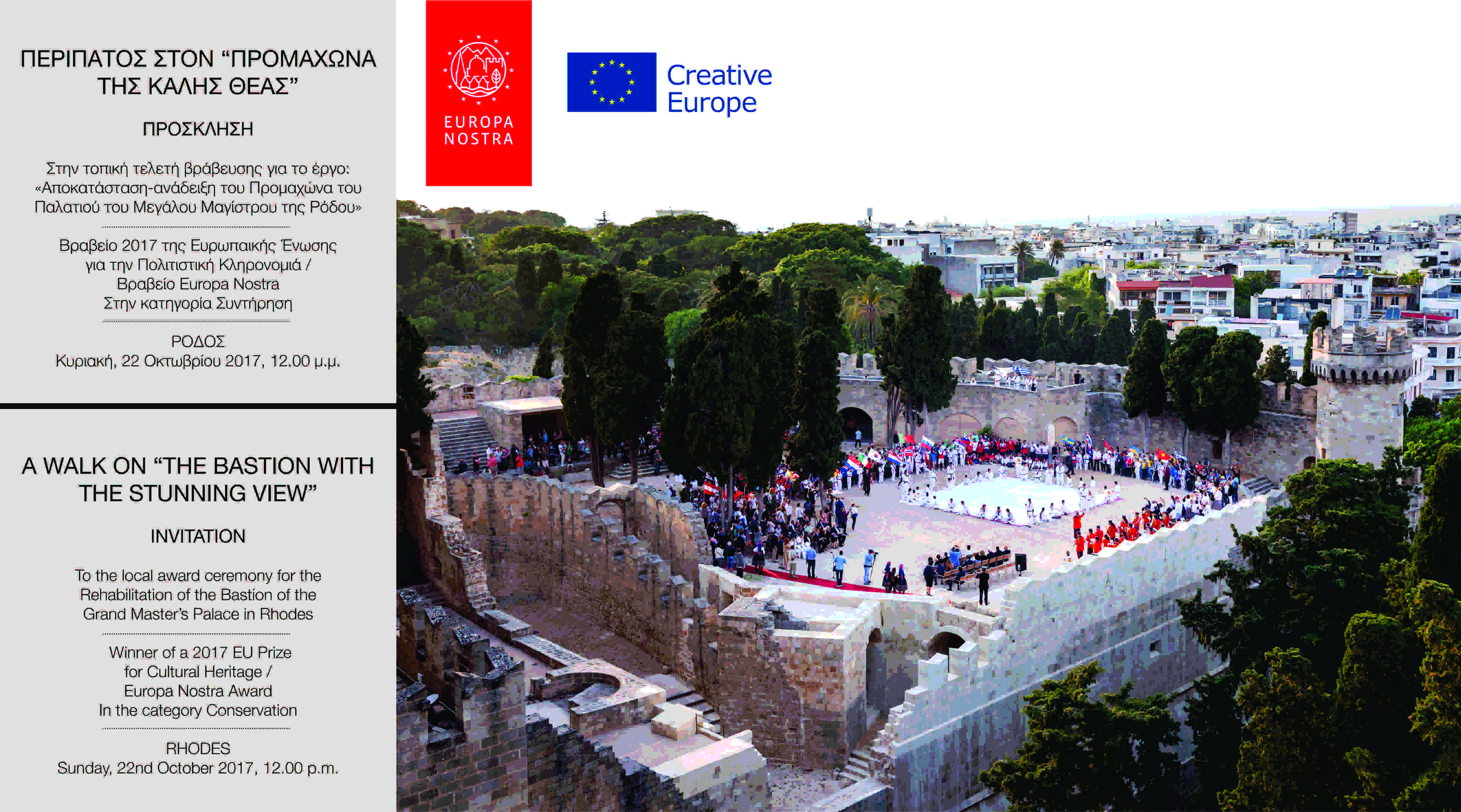 Κυριακή 22 Οκτωβρίου Στον Προμαχώνα του Παλατιού του Μεγάλου Μαγίστρου θα πραγματοποιηθεί η τελετή βράβευσης του έργου αποκατάστασης - ανάδειξής του από την EU/Europa Nostra, που περιλαμβάνει: