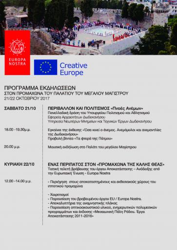 Η Εφορεία Αρχαιοτήτων Δωδεκανήσου και η Υπηρεσία Νεωτέρων Μνημείων και Τεχνικών Έργων Δωδεκανήσου, διοργανώνουν το Σάββατο 21 και την Κυριακή 22 Οκτωβρίου, διήμερο εκδηλώσεων για την απόδοση του Προμαχώνα του Παλατιού του Μεγάλου Μαγίστρου στο κοινό, με αφορμή την βράβευση του έργου αποκατάστασης-ανάδειξης του με το σημαντικό βραβείο της Ευρωπαϊκής Ένωσης για την πολιτιστική κληρονομιά / Βραβείο Europa Nostra 2017. Αναλυτικά το πρόγραμμα των εκδηλώσεων: