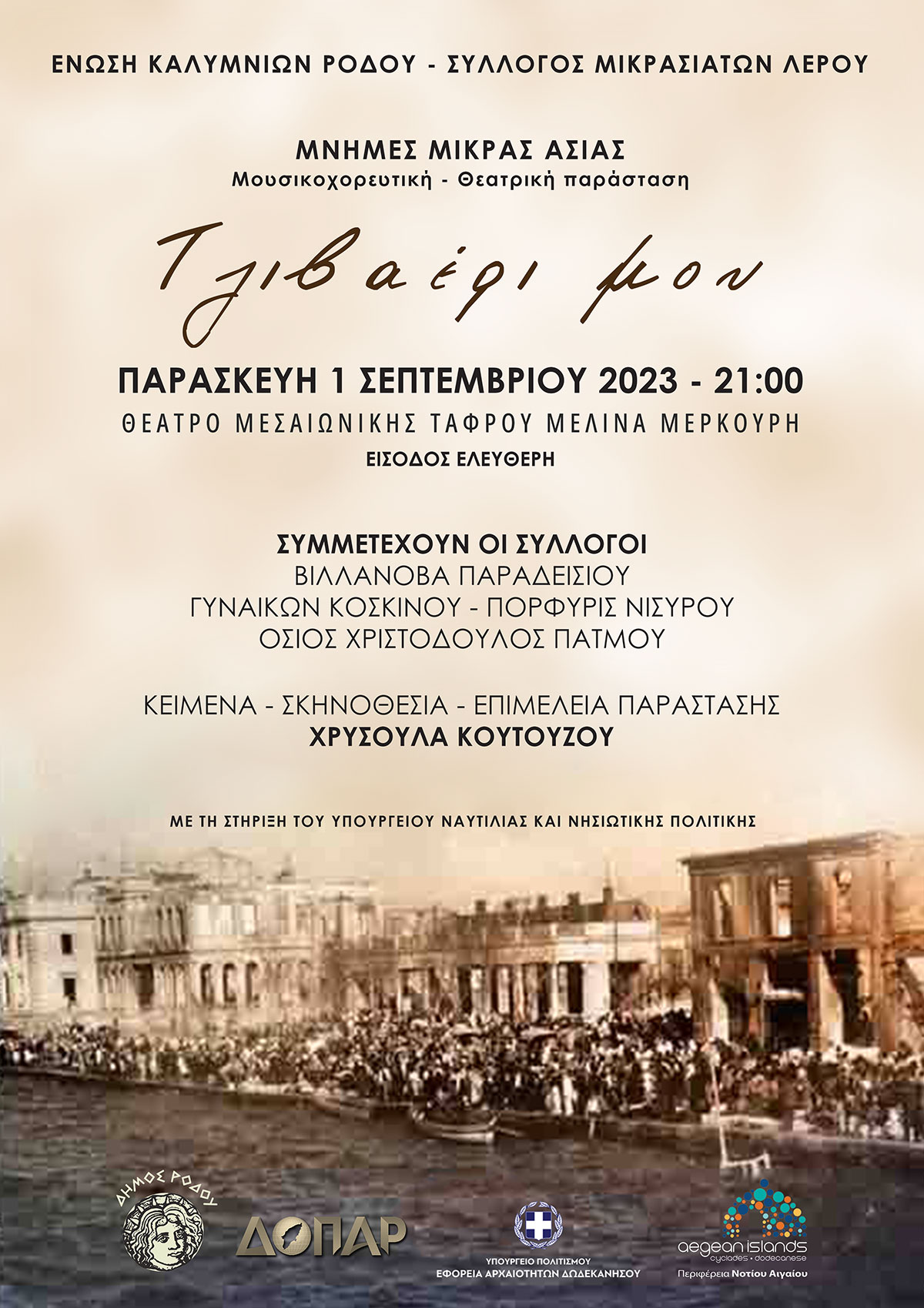 Μια αληθινά συγκλονιστική και διαφορετική παράσταση με την στήριξη του Υπουργείου Ναυτιλίας και Νησιωτικής Πολιτικής που συνδιοργανώνουν η Ένωση Καλυμνίων Ρόδου, ο Σύλλογος Μικρασιατών Λέρου, το Υπουργείο Πολιτισμού (Εφορεία Αρχαιοτήτων Δωδεκανήσου), η Περιφέρεια Νοτίου Αιγαίου και ο Δήμος Ρόδου (ΔΟΠΑΡ), με τη συμμετοχή των συλλόγων Βιλλανόβα Παραδεισίου, Γυναικών Κοσκινού και τους Παροικιακούς Συλλόγους Πατμίων και Νισυρίων Ρόδου.