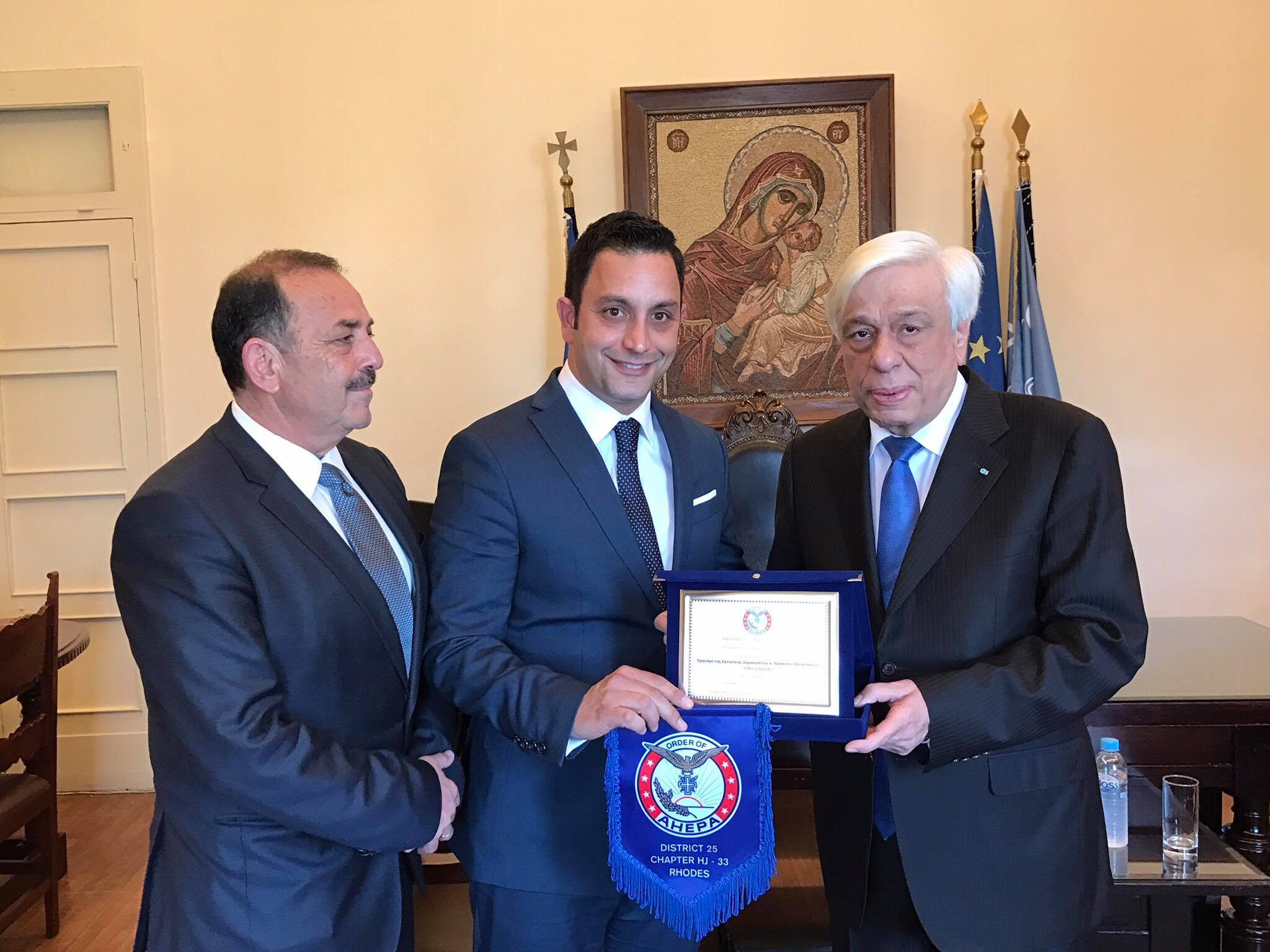 ΔΕΛΤΙΟ ΤΥΠΟΥ-Την Α.Ε. τον Πρόεδρο της Ελληνικής Δημοκρατίας κ. Προκόπιο Παυλόπουλο, τίμησε το Τμήμα AHEPA HELLAS HJ–33 Ρόδου, τη Δευτέρα 6 Μαρτίου. Ο κ. Πρόεδρος επισκέφθηκε την περιοχή μας, για τις επίσημες εκδηλώσεις του Εορτασμού της Επετείου της Ενώσεως της Δωδεκανήσου με την Ελλάδα και την επίσημη τελετή ανακήρυξής του ως Επιτίμου Δημότη Ρόδου. Με την ευκαιρία αυτή ο Γραμματέας του Τμήματος AHEPA HELLAS HJ–33 Ρόδου κ. Αντώνιος Γιαννικουρής, συναντήθηκε με τον Πρόεδρο της Δημοκρατίας και τον ενημέρωσε για τις δράσεις της ΑΧΕΠΑ στη Ρόδο και του επέδωσε εκ μέρους του Δ.Σ. του Τμήματος και του Προέδρου Αρχιμανδρίτου π. Ραφαήλ Σίδερη, τιμητική πλακέτα και αναμνηστικό λάβαρο με το έμβλημα της ΑΧΕΠΑ. Ο κ. Πρόεδρος εξέφρασε την ικανοποίησή του, για τις αξιόλογες δράσεις του Τμήματος μας και μας παρότρυνε να συνεχίσουμε το έργο μας με αμείωτη ένταση, υπέρ του ακριτικού νησιού μας και των κατοίκων του.