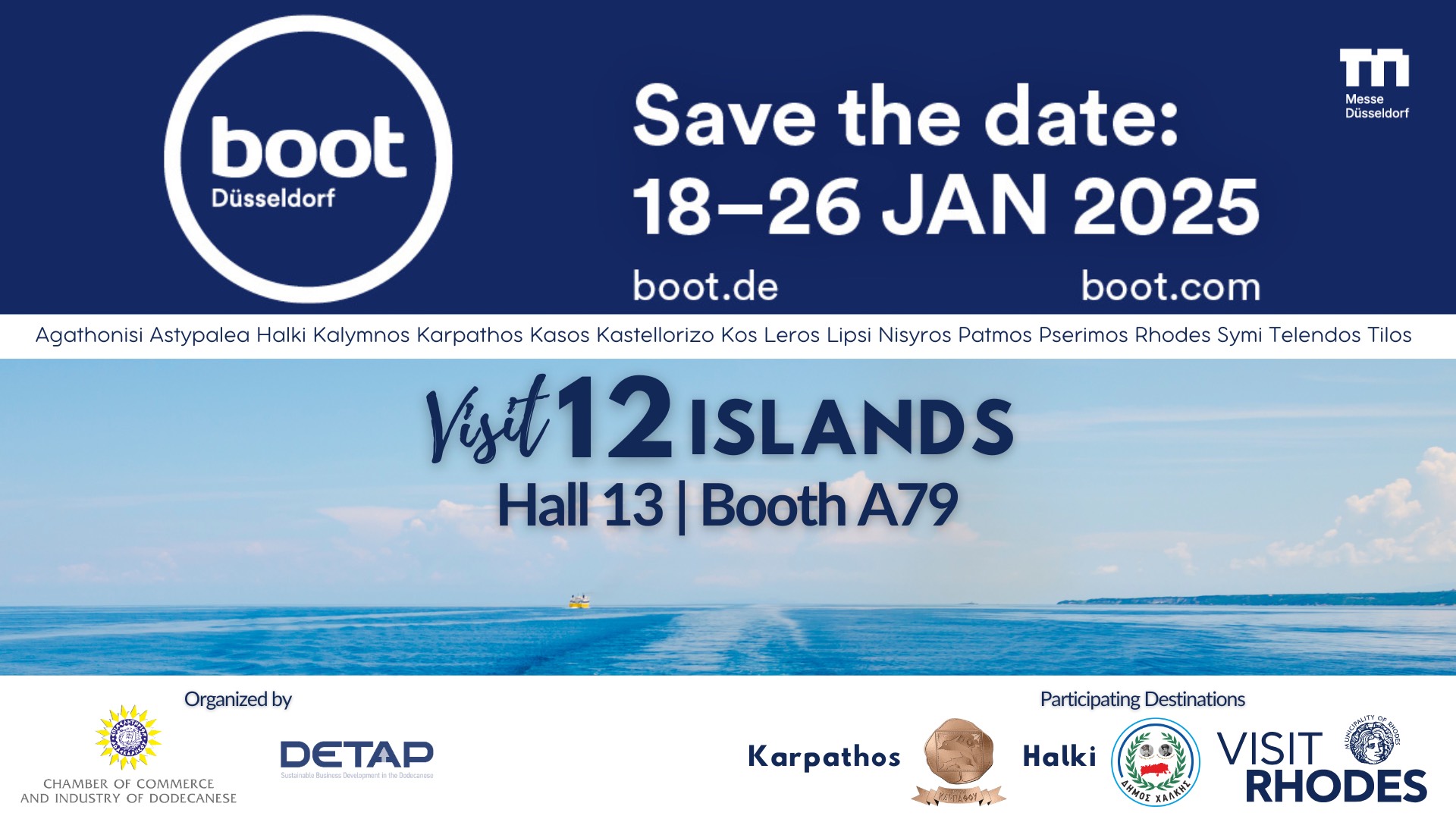 Το Επιμελητήριο Δωδεκανήσου συμμετέχει για 3η συνεχόμενη χρονιά στη Διεθνή Έκθεση Θαλάσσιου Τουρισμού BOOT 2025, που θα διεξαχθεί στο Ντίσελντορφ της Γερμανίας από τις 18 έως τις 26 Ιανουαρίου 2025. Η BOOT, η μεγαλύτερη έκθεση θαλάσσιου τουρισμού στον κόσμο, συγκεντρώνει κάθε χρόνο χιλιάδες επαγγελματίες και επισκέπτες, αποτελώντας σημείο αναφοράς για τον κλάδο.