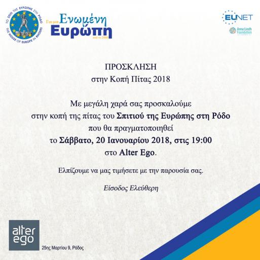 Το Σπίτι της Ευρώπης στη Ρόδο προσκαλεί όλα τα μέλη, τις φίλες και τους φίλους του στην ετήσια κοπή της Βασιλόπιτας του, τo Σάββατο, 20 Ιανουαρίου 2018, στις 19:00 στο Alter Ego (25ης Μαρτίου 9, Ρόδος).