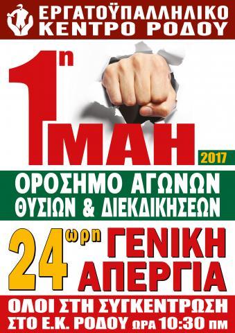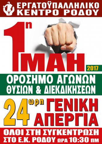 ΔΕΛΤΙΟ ΤΥΠΟΥ-1η ΜΑΗ 2017 -24ωρη Πανελλαδική Απεργία -Τιμώντας όλους εκείνους που αγωνίστηκαν και θυσιάστηκαν για την Ελευθερία,τη Δημοκρατία, τη Δικαιοσύνη και τα δικαιώματα των εργατών. ΚΑΛΟΥΜΕ Τα συνδικάτα, τους εργαζόμενους, ολόκληρη την κοινωνία σε συστράτευσηστον αγώνα της αντίστασης και της πάλης και σε μαζική συμμετοχή στις πρωτομαγιάτικες συγκεντρώσεις. ΑΠΕΡΓΟΥΜΕ – ΔΙΕΚΔΙΚΟΥΜΕ – ΑΠΑΙΤΟΥΜΕ Κατάργηση όλων των αντεργατικών μνημονιακών διατάξεων. Επαναφορά του Συλλογικού Δικαίου και άμεση δυνατότητα σύναψης Συλλογικών συμβάσεων εργασίας και προσφυγής στη Διαιτησία. Πιστή τήρηση του εναπομείναντος εργατικού Δικαίου. Φραγμό στις απολύσεις και στη σύναψη ατομικών συμβάσεων εργασίας με εξευτελιστικούς όρους. Μέτρα με προοπτική ανάπτυξης και προστασίας των θέσεων εργασίας. Μέτρα κατά της συνεχώς εντεινόμενης ασυδοσίας και βαρβαρότητας των εργοδοτών.