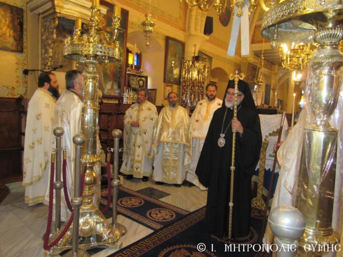 ΤΟ ΤΕΣΣΑΡΑΚΟΝΘΗΜΕΡΟΝ ΜΝΗΜΟΣΥΝΟΝ ΤΟΥ ΣΥΜΗΣ ΧΡΥΣΟΣΤΟΜΟΥ ΤΟΥ Α΄ IMG 7891Σήμερα 17η Φεβρουαρίου 2018, Σάββατον τῆς Τυρινῆς, συμπληρώθηκαν τεσσαράκοντα ἡμέρες ἀπό τῆς πρός Κύριον ἐκδημίας τοῦ μακαριστοῦ Μητροπολίτου Σύμης κυροῦ Χρυσοστόμου τοῦ Α΄. Ὡς ἐκ τούτου, σέ κλίμα ἰδιαιτέρας συγκινήσεως ἐτελέσθη τό πρωί στόν Ἱερό Μητροπολιτικό Ναό τοῦ Τιμίου Προδρόμου Θεία Λειτουργία ἐκ τῶν Ἐφημερίων τῆς Νήσου, χοροστατοῦντος τοῦ Σεβασμιωτάτου Τοποτηρητοῦ τῆς Ἱερᾶς Μητροπόλεώς μας, Μητροπολίτου Κώου καί Νισύρου κ. Ναθαναήλ. Πρό τῆς ἀπολύσεως, προεξάρχοντος τοῦ Σεβασμιωτάτου Τοποτηρητοῦ καί συμπαραστατουμένου αὐτοῦ ἐκ τοῦ Πανοσ. Ἡγουμ. τῆς Ἱ. Μονῆς Πανορμίτου Ἀρχιμ. π. Ἱεροθέου Κοενάκη καί τῶν λειτουργῶν Ἱερέων, ἔλαβε χώρα τό ἱερόν Μνημόσυνον μέ τήν συμμετοχή τῶν Τοπικῶν Στρατιωτικῶν, Λιμενικῶν, Ἀστυνομικῶν κ.λπ. Ἀρχῶν, τοῦ Δημάρχου Σύμης κ. Ἐλ. Παπακαλοδούκα, τῶν Ἐφόρων τῆς Ἱ. Μονῆς Πανορμίτου, τῶν Νομικῶν Συμβούλων αὐτῆς Θεοδ. Παπαγεωργίου Ἄρχοντος Δικαιοφύλακος τοῦ Οἰκουμενικοῦ Θρόνου καί τοῦ υἱοῦ αὐτοῦ Μιχ. Παπαγεωργίου, ἀλλά καί πολύ κόσμου πού προσῆλθε γιά νά τιμήσει τήν μνήμη τοῦ ἀοιδίμου Ποιμενάρχου μας καί νά συμπροσευχηθεῖ ὑπέρ ἀναπαύσεως τῆς ψυχῆς αὐτοῦ.