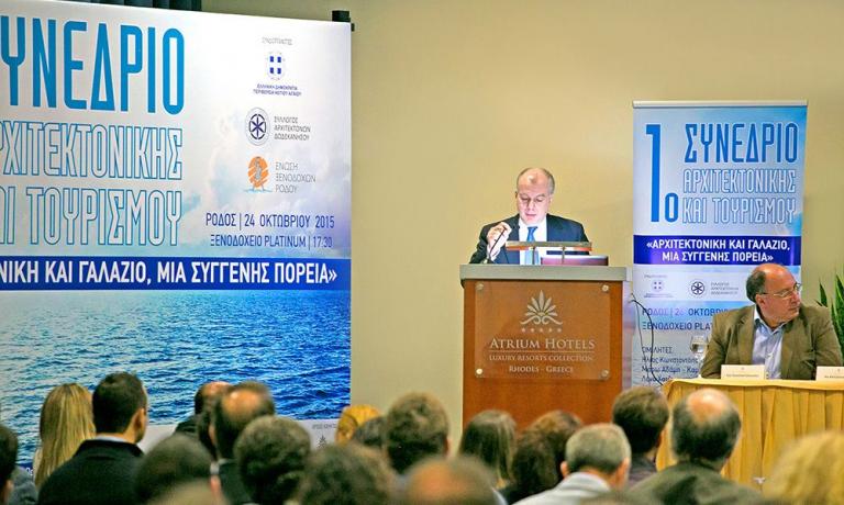 ΜΕΓΑΛΗ ΕΠΙΤΥΧΙΑ ΕΙΧΕ ΤΟ 1Ο ΣΥΝΕΔΡΙΟ ΑΡΧΙΤΕΚΤΟΝΙΚΗΣ ΚΑΙ ΤΟΥΡΙΣΜΟΥ -Με μεγάλη επιτυχία διεξήχθη το 1ο Συνέδριο Αρχιτεκτονικής και Τουρισμού με τίτλο «Αρχιτεκτονική και Γαλάζιο, μια συγγενής πορεία» στις 24 Οκτωβρίου 2015 στο ξενοδοχείο Platinum. Η τοπική κοινωνία αγκάλιασε θερμά την συγκεκριμένη πρωτοβουλία όπου το μεγάλο πλήθος των συμμετεχόντων δημιούργησε μια κατάμεστη αίθουσα μέχρι και τη λήξη των εργασιών του Συνεδρίου αργά το ίδιο βράδυ, γεγονός που δίνει σημαντική ώθηση στους οργανωτές προκειμένου να εντείνουν τις απαραίτητες διεργασίες με στόχο την οργάνωση του επόμενου βήματος. Το Συνέδριο συνδιοργανώθηκε από την Περιφέρεια Νοτίου Αιγαίου, τον Σύλλογο Αρχιτεκτόνων Δωδεκανήσου και την Ένωση Ξενοδόχων Ρόδου. Μέσα από τις εισηγήσεις των εκλεκτών και διεθνούς εμβέλειας εισηγητών του Συνεδρίου, καθώς και μέσα από την γενικότερη διαβούλευση τέθηκε ένας γόνιμος διάλογος μεταξύ Αρχιτεκτονικής και Τουρισμού, ο οποίος προκάλεσε την πεποίθηση ότι μπορεί να συμβάλλει με σταθερά βήματα σε ουσιαστικό βαθμό στη βιώσιμη εξέλιξη του τόπου μας. Κοινό τόπο μεταξύ των συνδιοργανωτών αποτέλεσε η πεποίθηση πως τα Συνέδρια αυτά λόγω της ευρύτερης σημασίας τους για τον τόπο μας, θα ήταν γόνιμο να εξελιχθούν σε διεθνή, προσελκύοντας επισκέπτες από όλον τον πλανήτη και αποτελώντας έναν ισχυρό επιστημονικό και τουριστικό θεσμό στη Ρόδο.