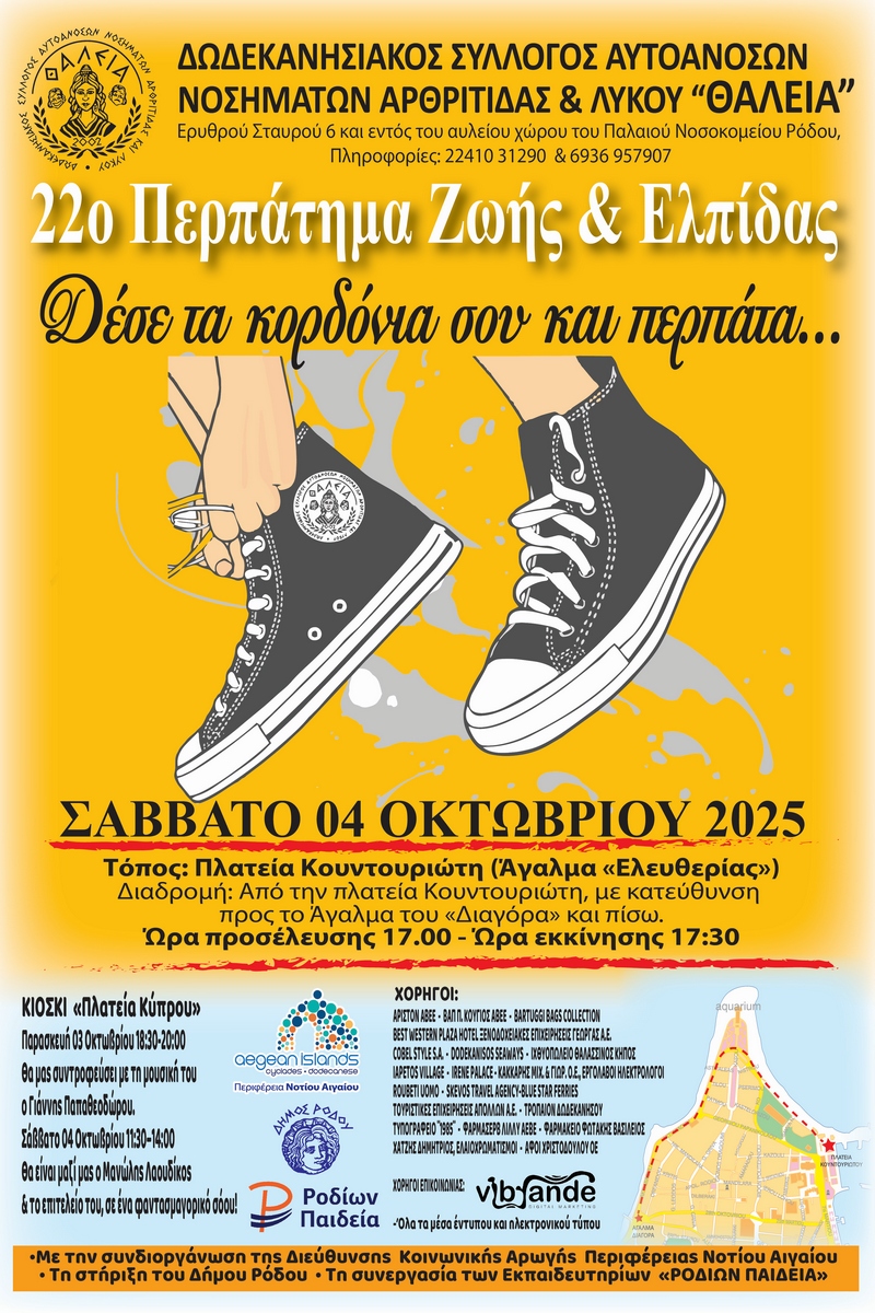 Η πρόεδρος Θάλεια Γεωργά και τα μέλη της ομάδας Περπατήματος του Δωδεκανησιακού Συλλόγου Αυτοάνοσων Νοσημάτων Αρθρίτιδας & Λύκου «ΘΑΛΕΙΑ», σας προσκαλούν στο 22ο Περπάτημα Ζωής & Ελπίδας!!!